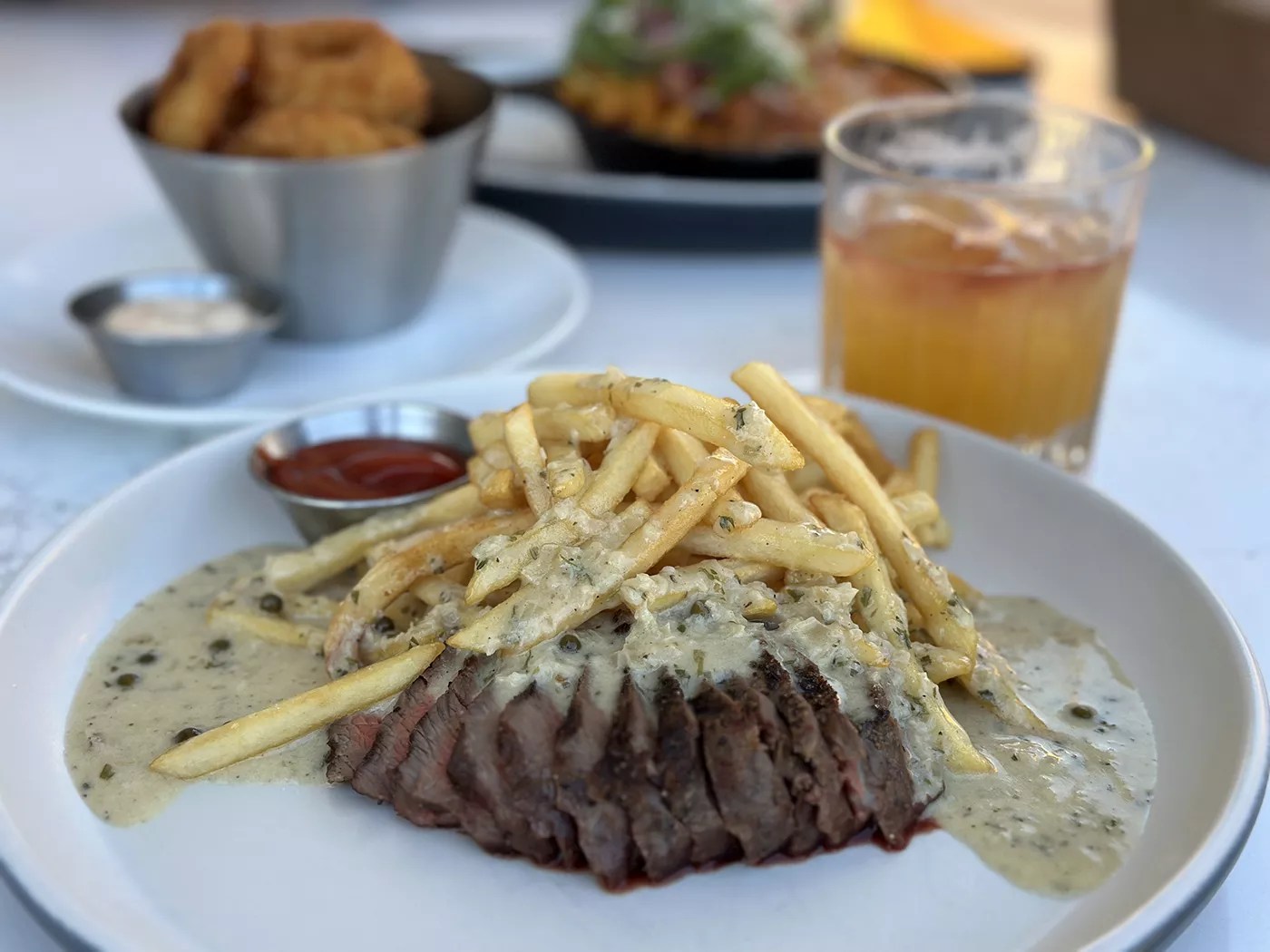We started with the gluten-free smoked trout dip ($14.50) and beef chiquito tacos ($12). The creamy smoked trout onion dip is served with housemade kettle chips. It’s a lighter alternative to the typical game-day dip. The tacos’ protein is flavorful beef slow-cooked in mole sauce. Steak and fries. Desiree Gutierrez