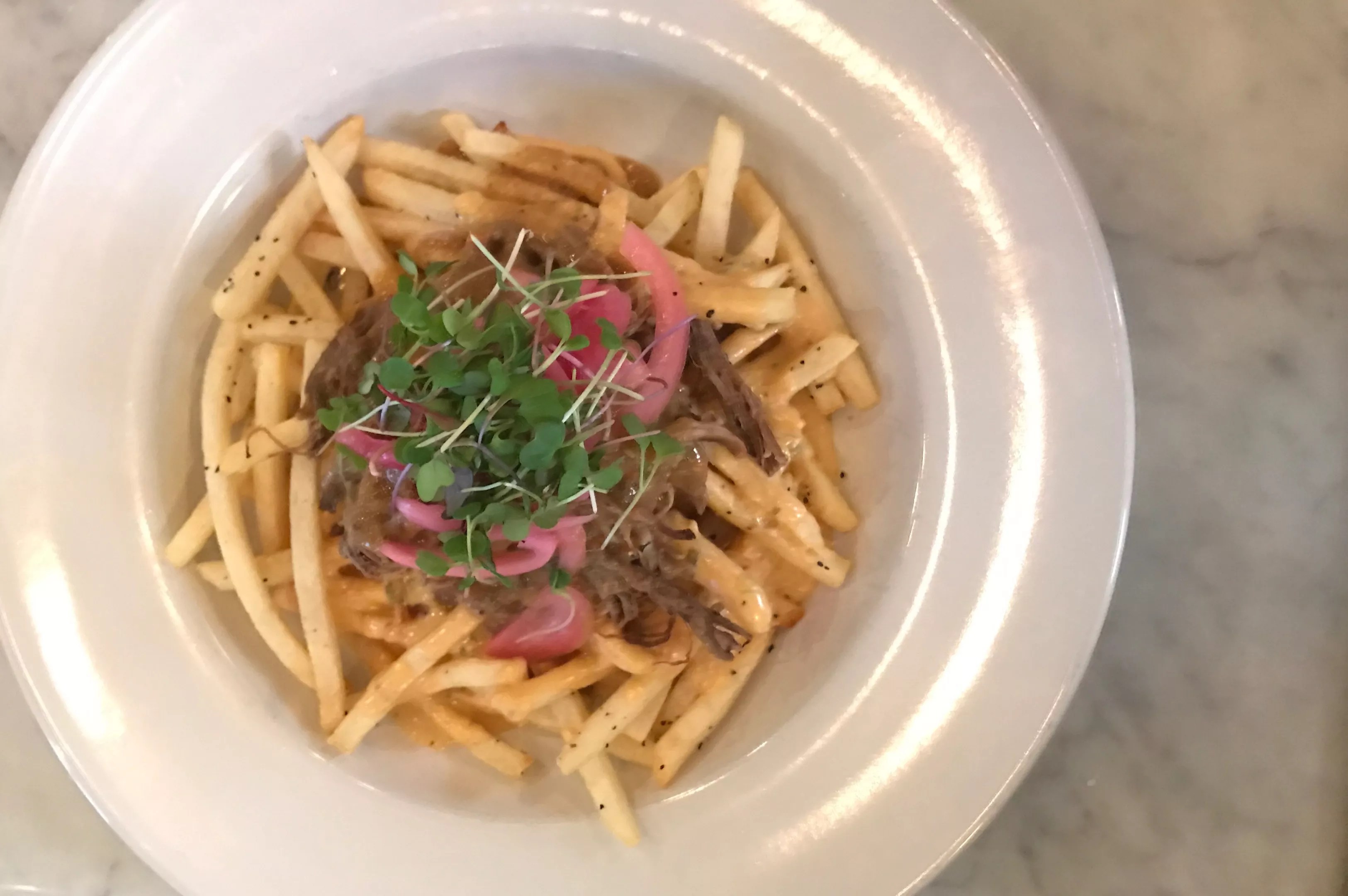 We tried some food, but the experience didn’t get much better. The Texas poutine ($14) involved ho-hum french fries (advertised as Parmesan truffle fries but with none of those flavor characteristics) covered in a “Southwest cheese sauce” that looked and tasted like ballpark nacho cheese. The shredded brisket was dry and flavorless, the microgreens seemingly useless. The edamame hummus ($8) was innocuous but boring, and it came bizarrely garnished with a purple orchid.