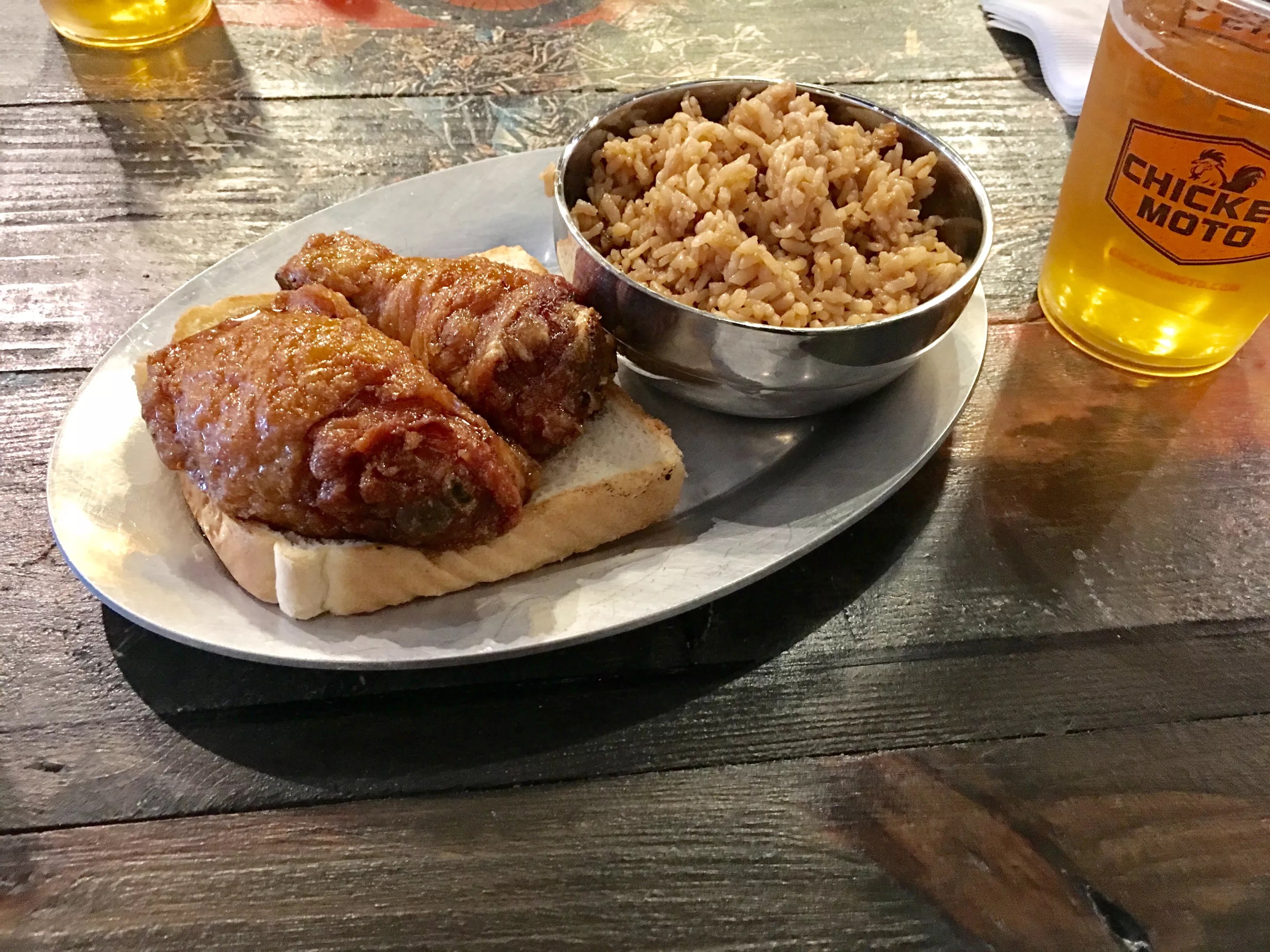 The chicken comes displayed on a slice of Texas toast (which is welcome when soaked with the soy-ginger sauce) and one side. There is rice, but most of the sides are other Texas mainstays: coleslaw and potato salad, to name a couple.