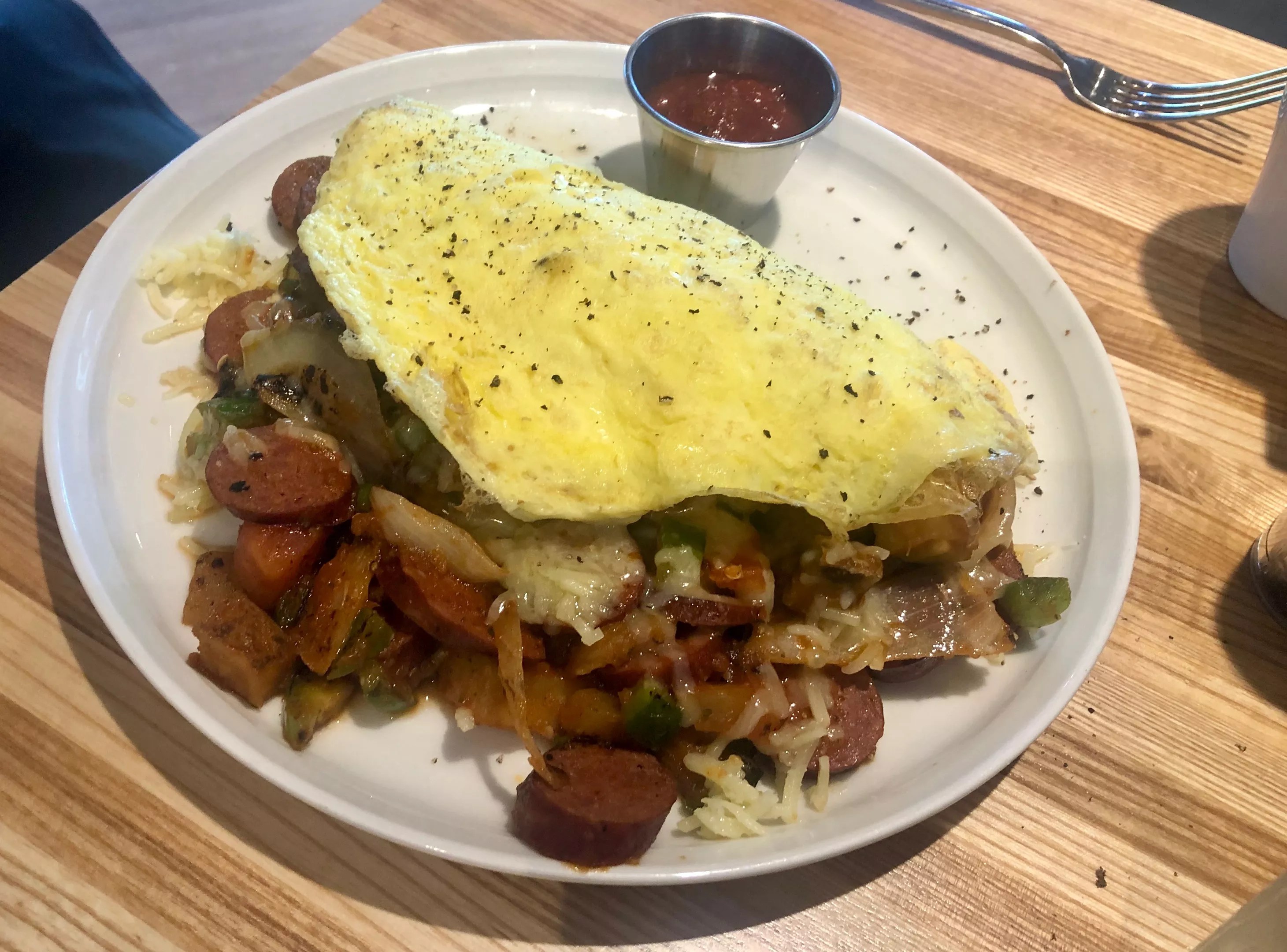 The two eggs, ordered over-medium, looked OK. Somehow, one was cooked perfectly (a seemingly rare feat for restaurants), but the other was overcooked (closer to what’s expected in most restaurants). The large cup of venison sausage is welcome, though no one needs that much meat. (To-go cup, please!)