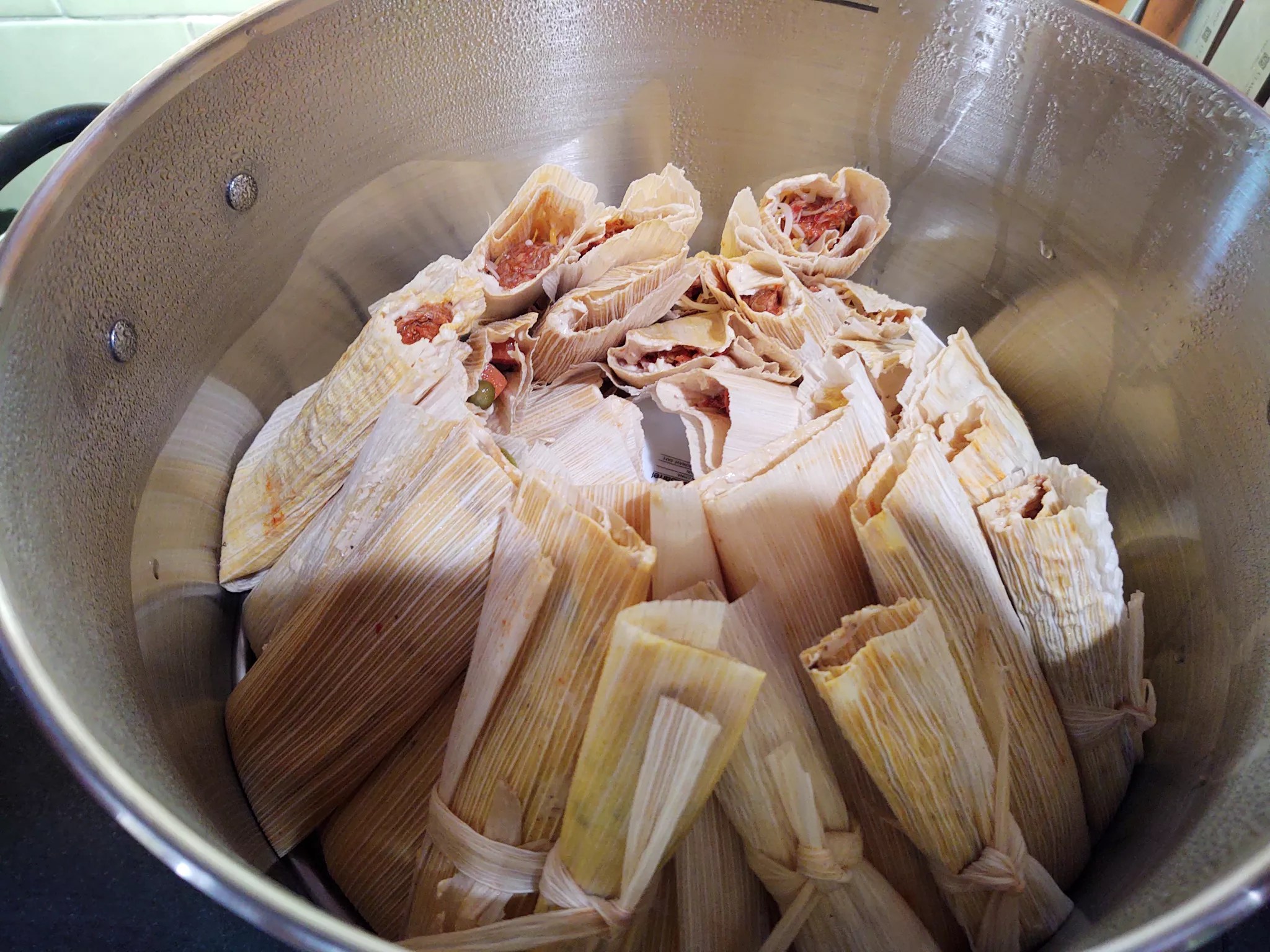 Jesse Sr. says to put a ball of foil in the middle of the steamer so the tamales can cook with their open ends up. An inverted bowl works, also.