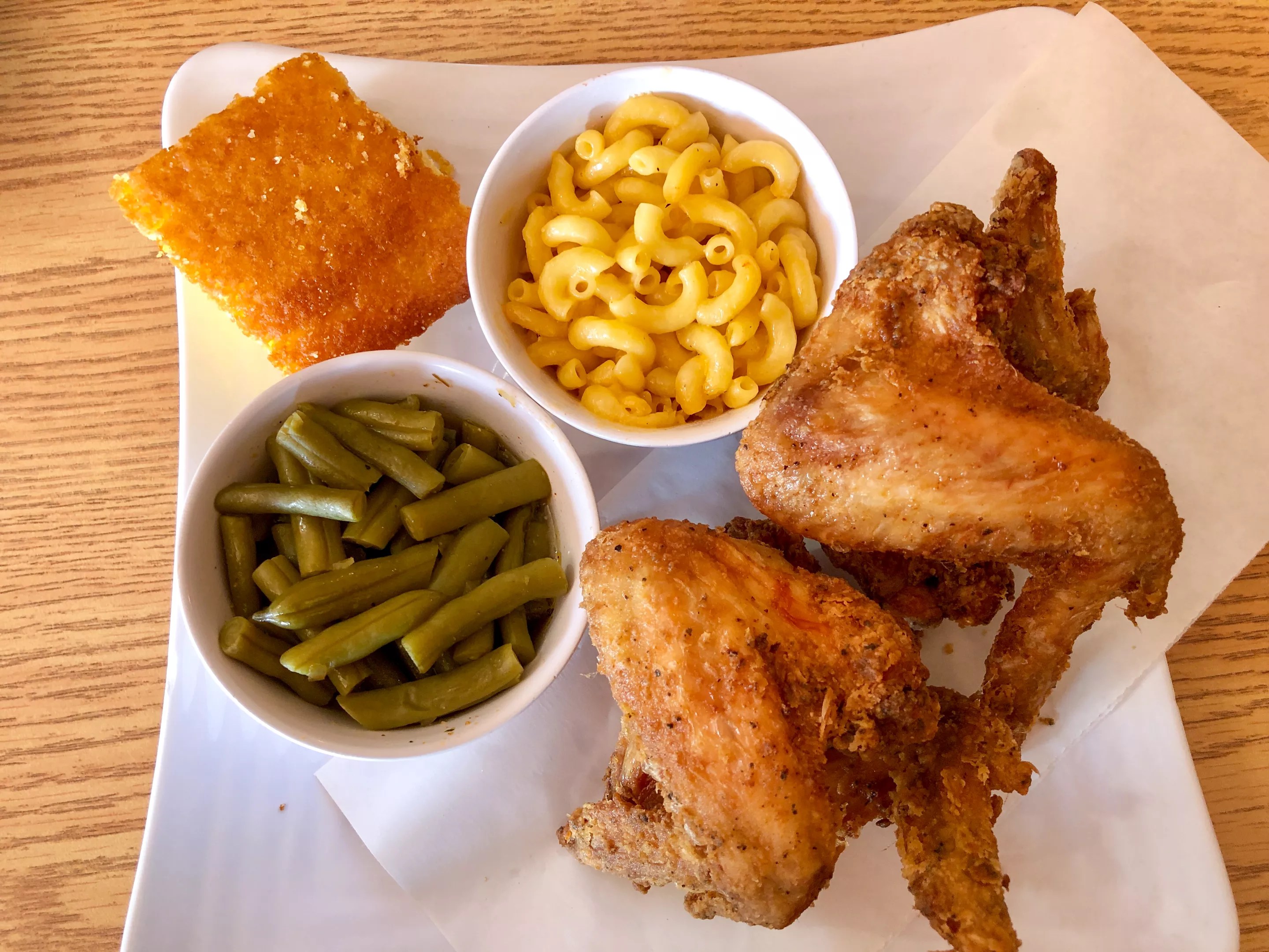 Chicken wings, macaroni and cheese, green beans and cornbread
