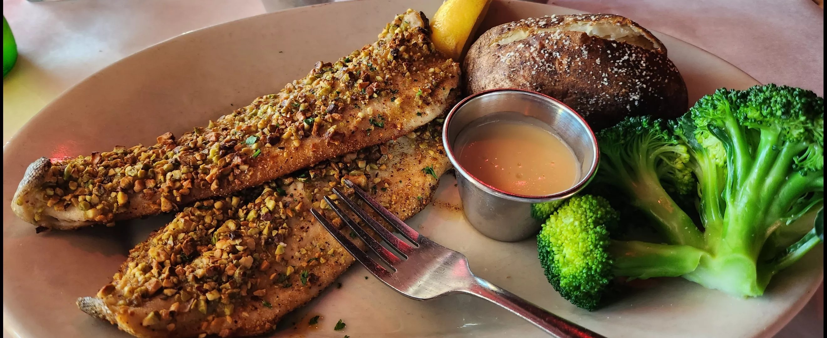 Salmon, snapper and trout are your fish choices, and we decided on the pistachio-crusted trout. It was cooked nicely, not dry, and the crumbled pistachios coating the fish added a crunch. The crawfish rémoulade served alongside it was super.