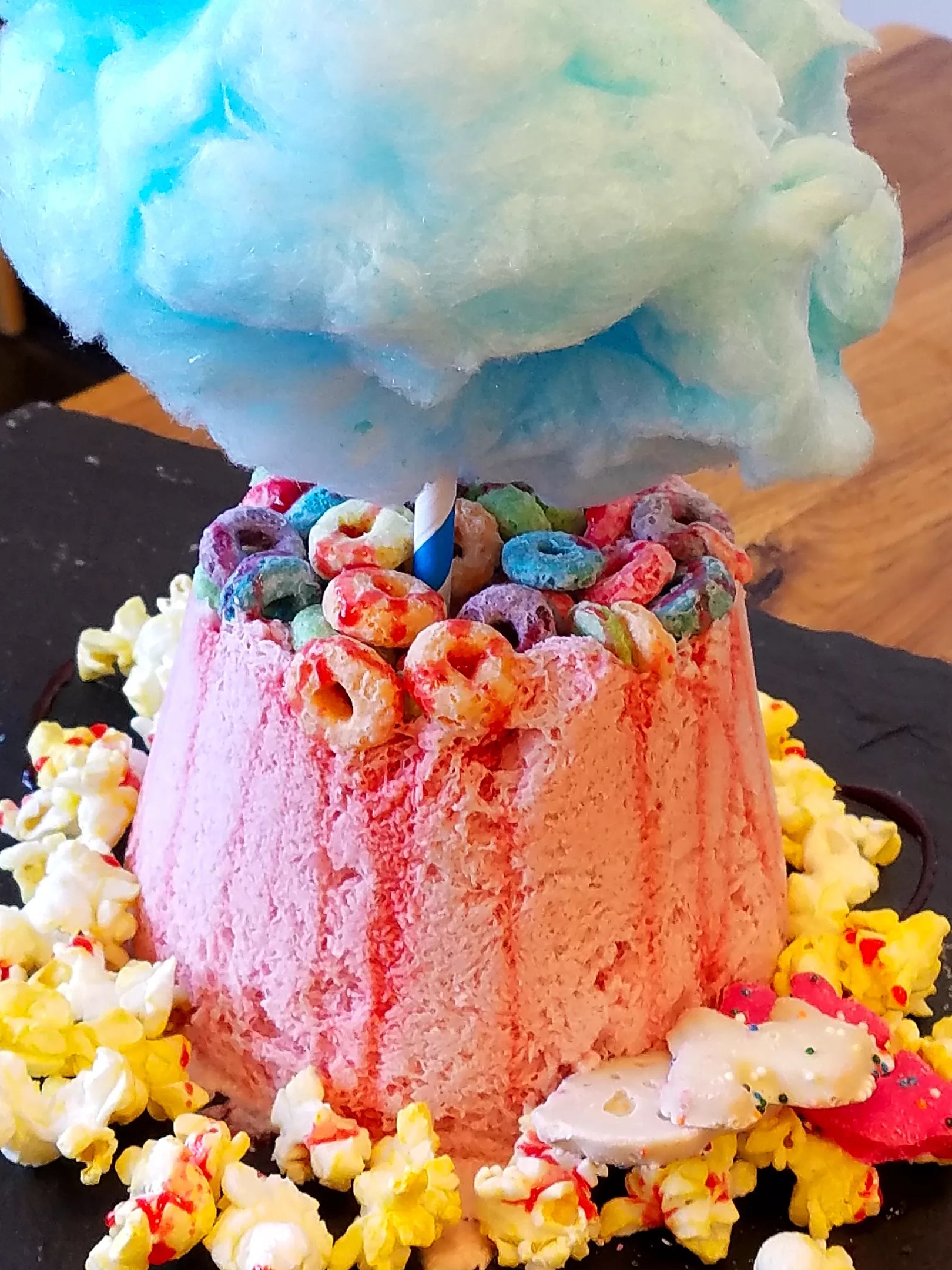 The Circus: strawberry snow, popcorn, circus animal cookies, fruit loops, and strawberry sauce, topped with freshly-spun cotton candy