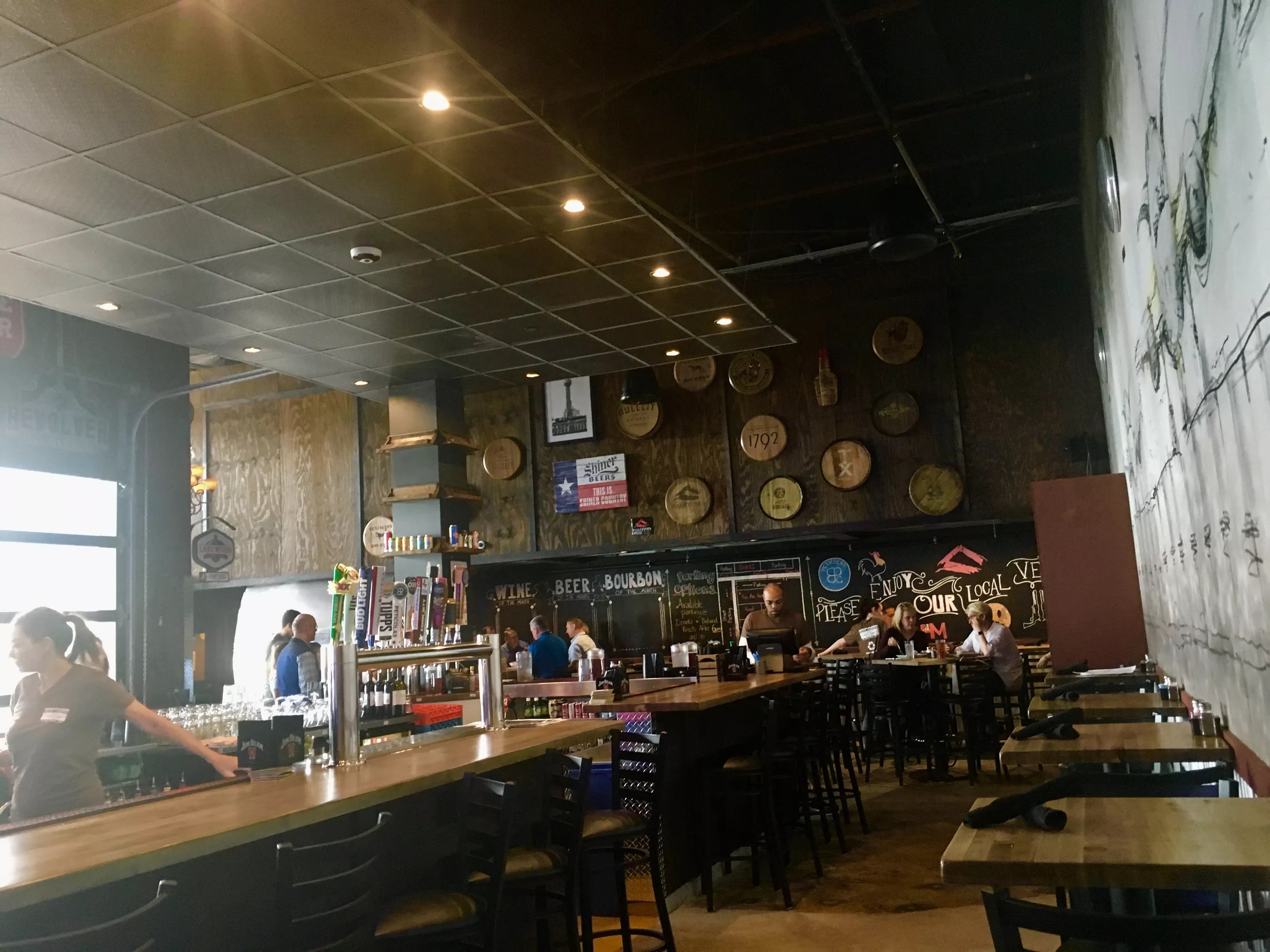 Below the wood wall is a chalkboard that announces Maple’s drinks: wine, beer and bourbon. The bar is an enormous “zero” shape, and cold beer arrives in Mason jars with handles. A wall-sized sketch is as big as the plane it’s depicting, a reminder that you’re a burnt ends-toss away from Love Field.