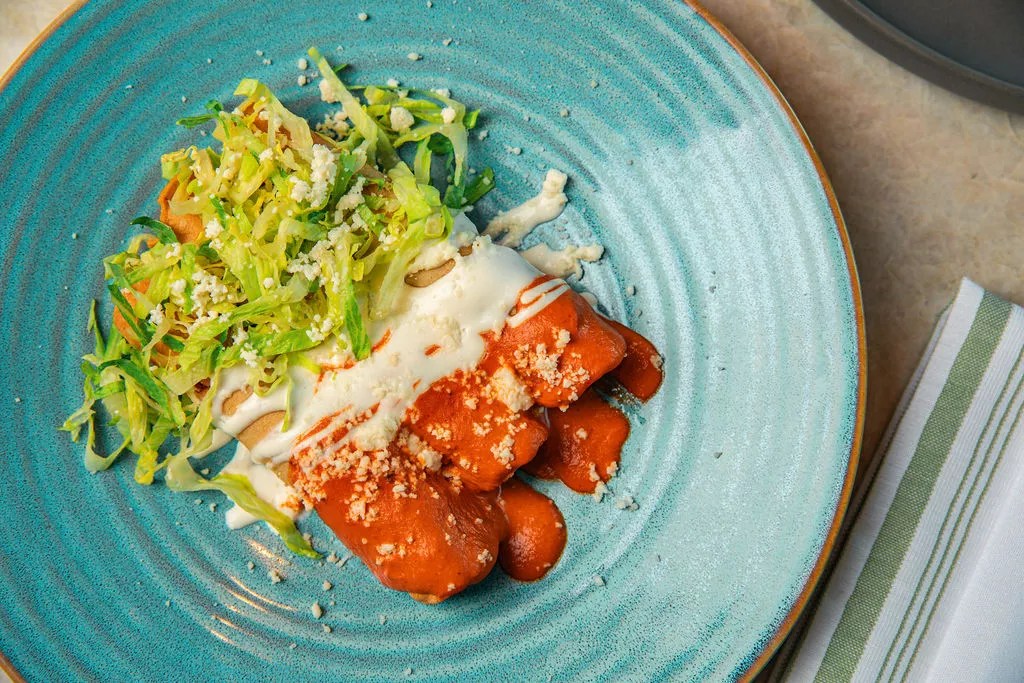 The flautas are crispy with a tender duck carnitas filling. The guajillo chili salsa is flavorful, not spicy.