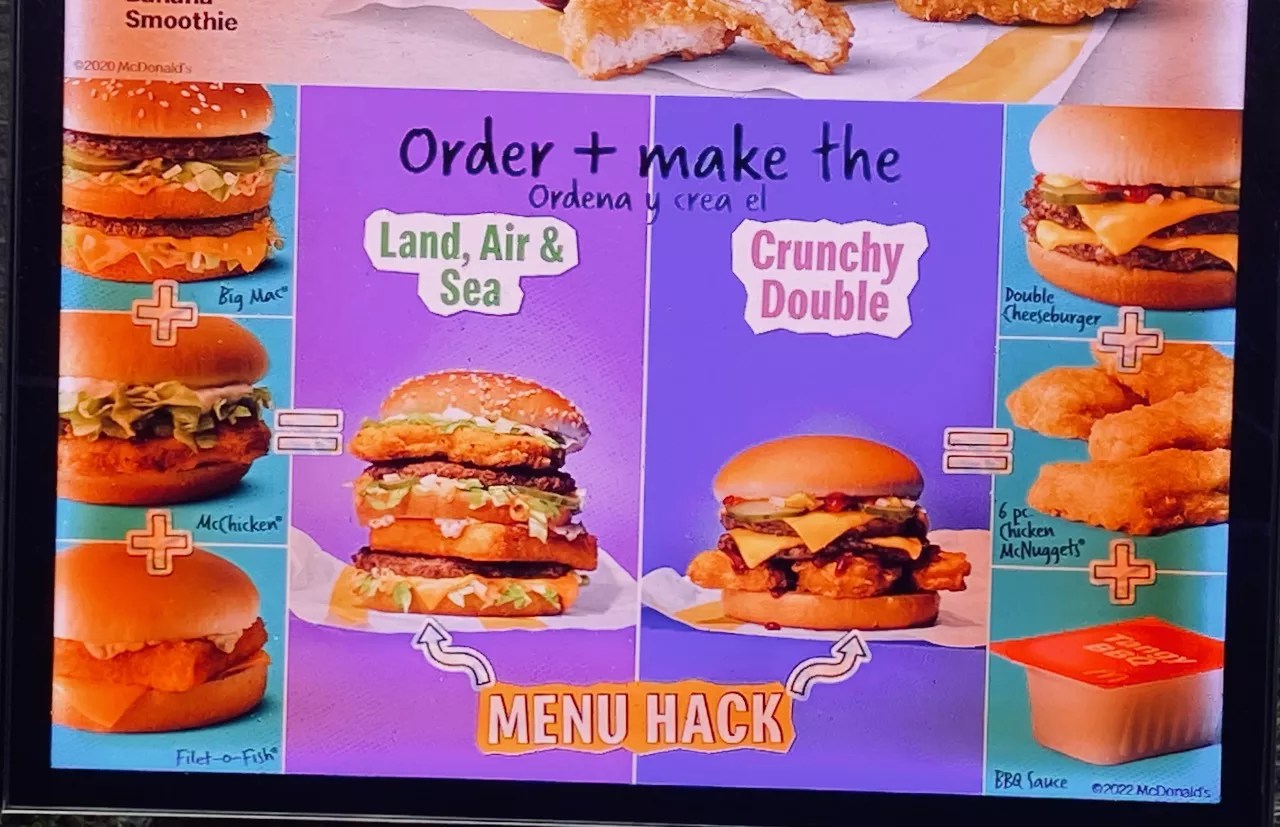 One of the chain’s hacks is the Land, Air and Sea Burger where the patties of a McChicken and a Filet-O-Fish sandwich are placed between the double-stacked Big Mac. The other is a Crunchy McDouble made with a double cheeseburger off the Dollar Menu with an order of Chicken McNuggets and a packet of barbecue sauce smothered under the top bun. They are both as repulsive as they sound even if the Crunchy McDouble kind of makes more sense.