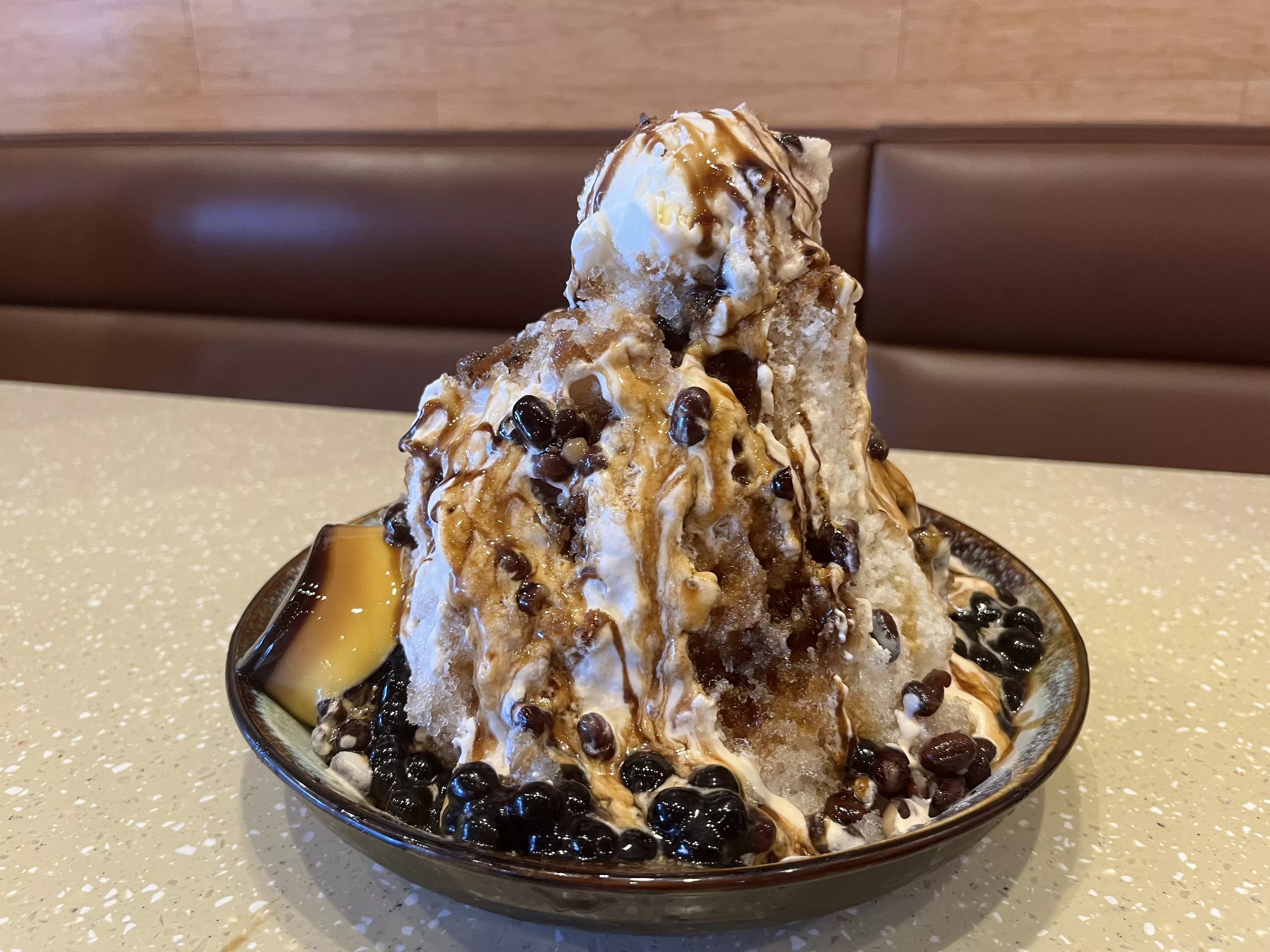 It’s topped with black sugar tapioca balls, sweetened red beans and a scoop of vanilla ice cream. The dessert makes for a unique combination of creamy, chewy and icy all at once.