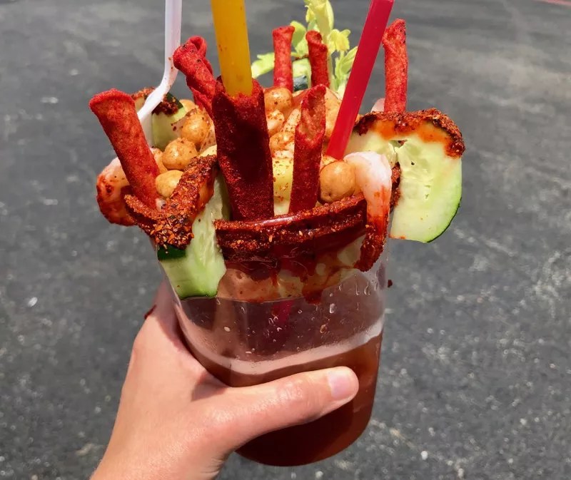 Nubias is a newly opened, cash-only spot selling botanas locas (“crazy snacks”) such as spicy strawberries and Kool-Aid pickle salads, along with michelada mixes to-go. For $25, Nubia Torres will fill a 32-ounce Mason jar with her tamarind- and spice-heavy Clamato mix, then she’ll top it with shrimp, cucumbers, Cracker nuts and tamarind-coated fruit strips. She estimates the jar will make around five micheladas, depending on how heavy you like your mix, and sells it as a “whole meal and drink in one.” In addition to having another Mason jar in the kitchen, what’s nice is that Nubias is the only business here that throws in a complimentary (bottle cap) beer to-go.