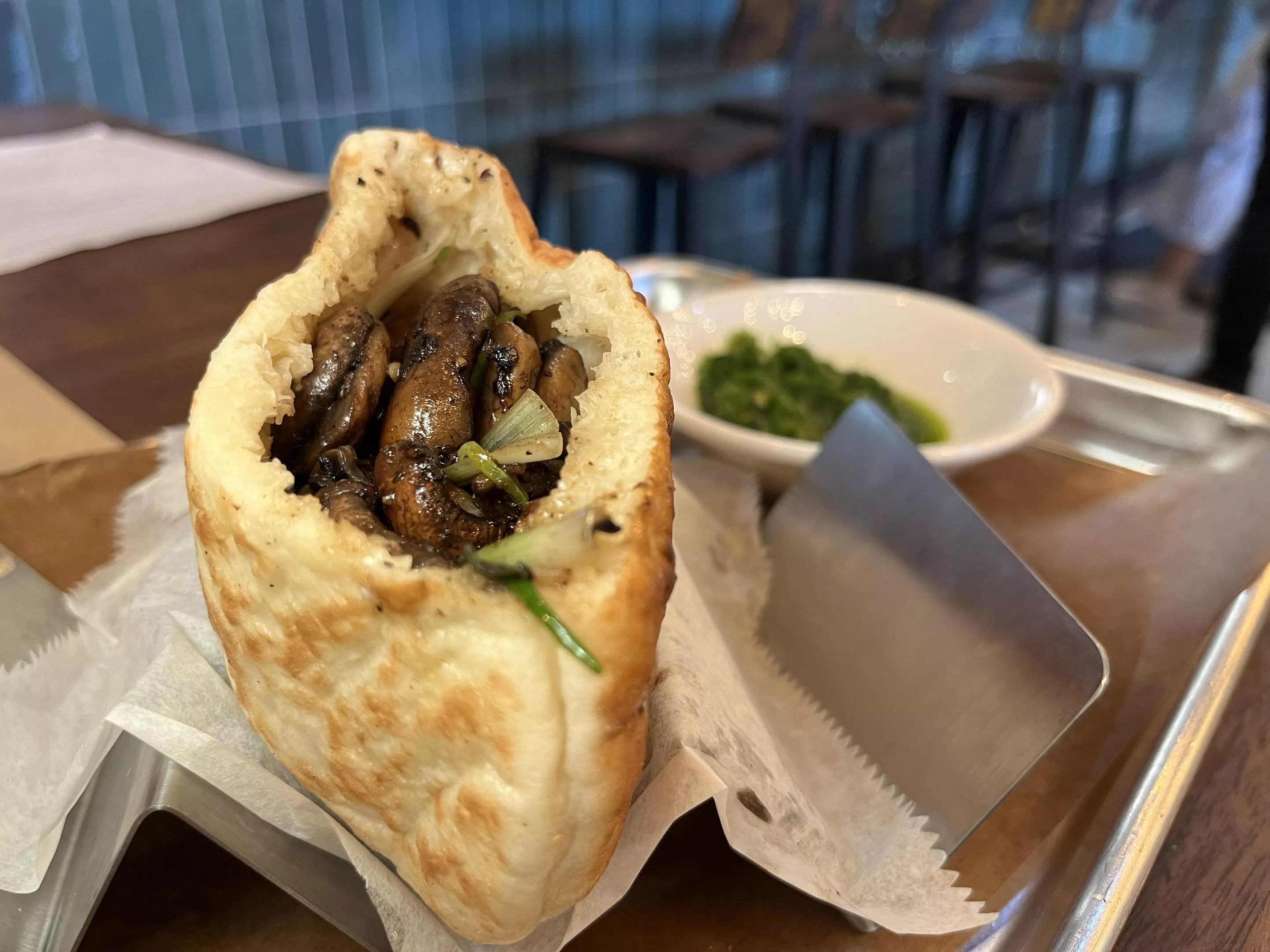 At the core of Miznon’s philosophy lies the belief that the pita is a womb: a vessel for culinary innovation. The best place to start would perhaps be their selection of 12 rotating pita pockets, each filled with a thoughtfully planned combination of meats, vegetables and spreads. Options like the wild mushroom – a pita filled with burned mushrooms, scallions and a sour cream spread – are more simplistic precursors to those like the folded cheeseburger stuffed with burger patty, burger aioli and cheese. The fish n’ chips come brimming artistically with a medley of fried fish, potatoes and pickles.
