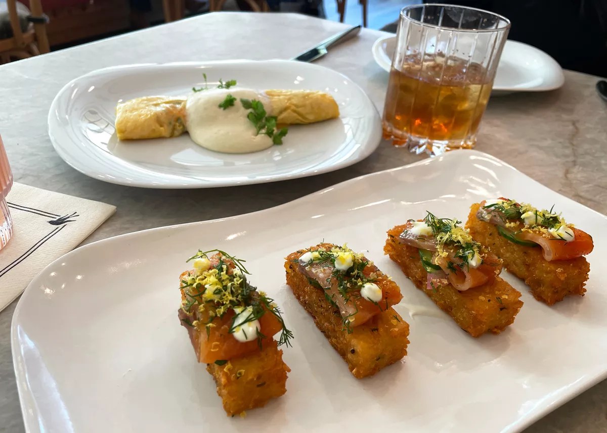The two pinnacles of brunch in their highest form: the French omelet and hand-formed potatoes.