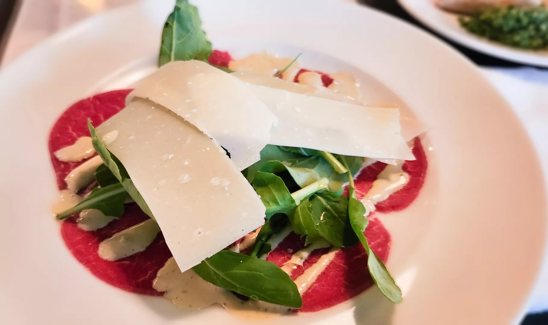 Next we went with an order of Carpaccio di Manzo ($17.50): thin slices of raw beef tenderloin, shaved Parmigiano and arugula dripped in aioli. It was outstanding. (See photo at top.)