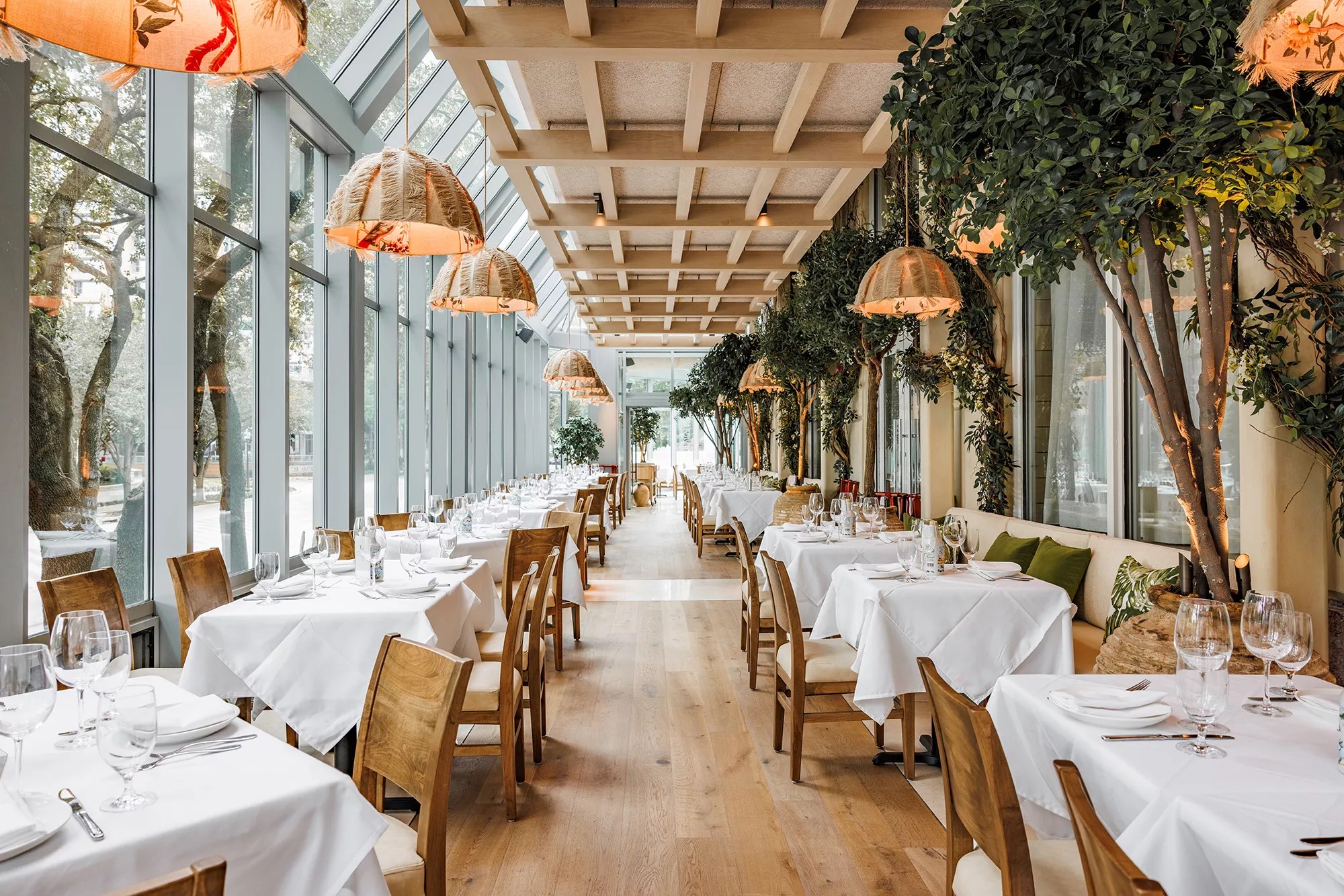 The Dallas outpost reflects Avra’s contemporary yet timeless aesthetic. The airy dining room is accented with 300-year-old stone planters imported from Greece, soft linens and abundant greenery, complemented by two outdoor patios and The Conservatory, a glass-walled café designed to evoke the feel of an island.