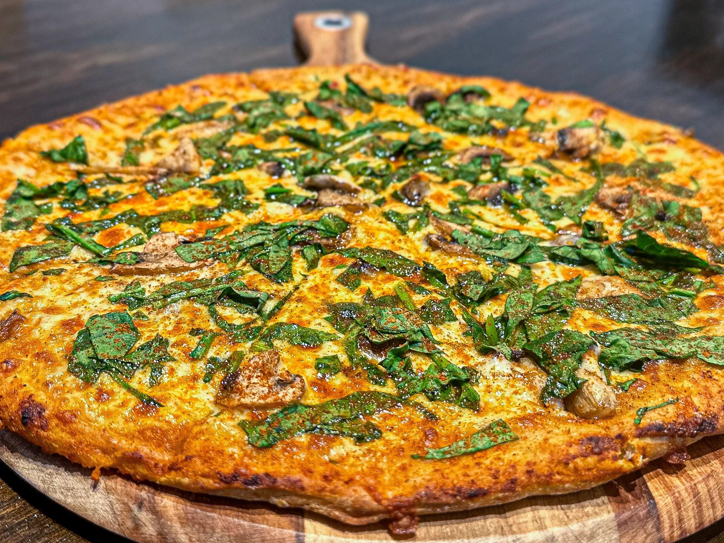 At Eastern Pizza Co., we recommend the spinach and mushroom pizza with a house-made sauce, garlic butter and mozzarella.