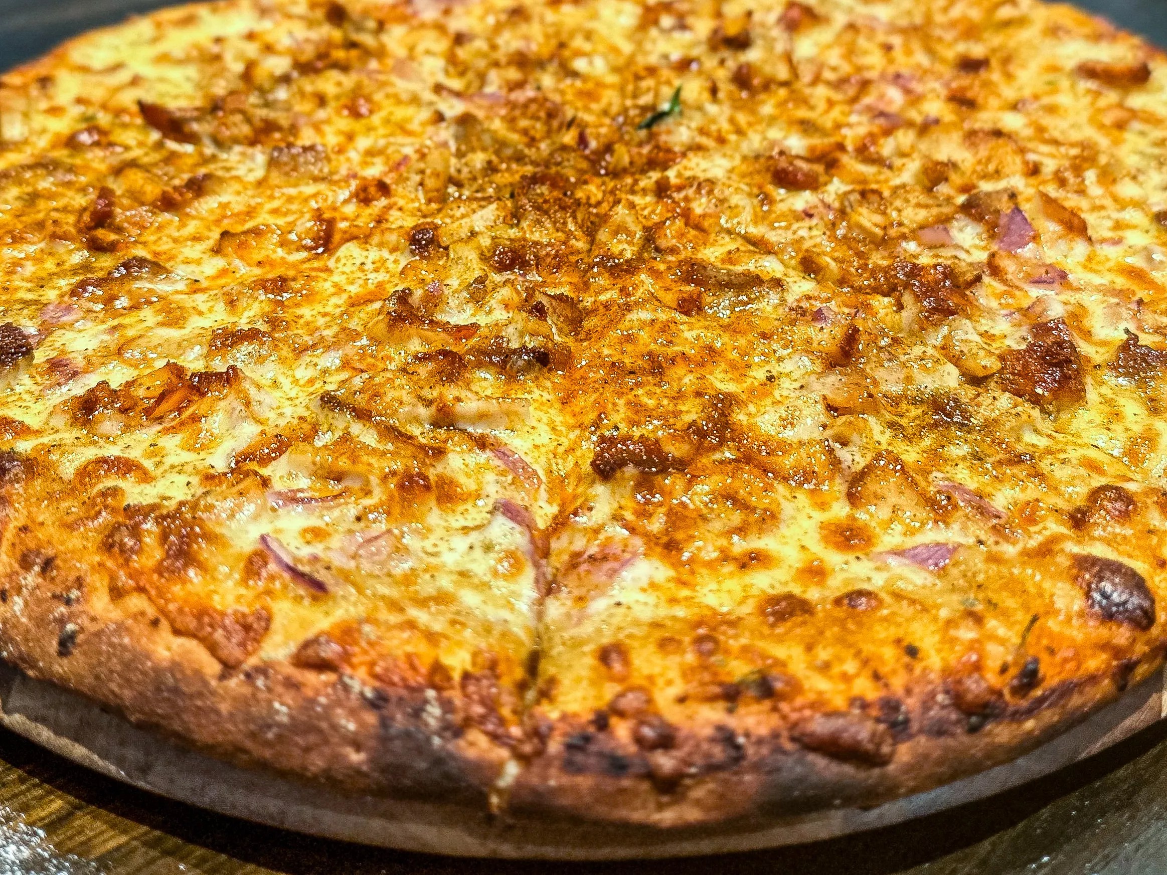 Butter chicken masala: house pizza sauce, onions, butter chicken, mozzarella, and drizzle of butter masala.
