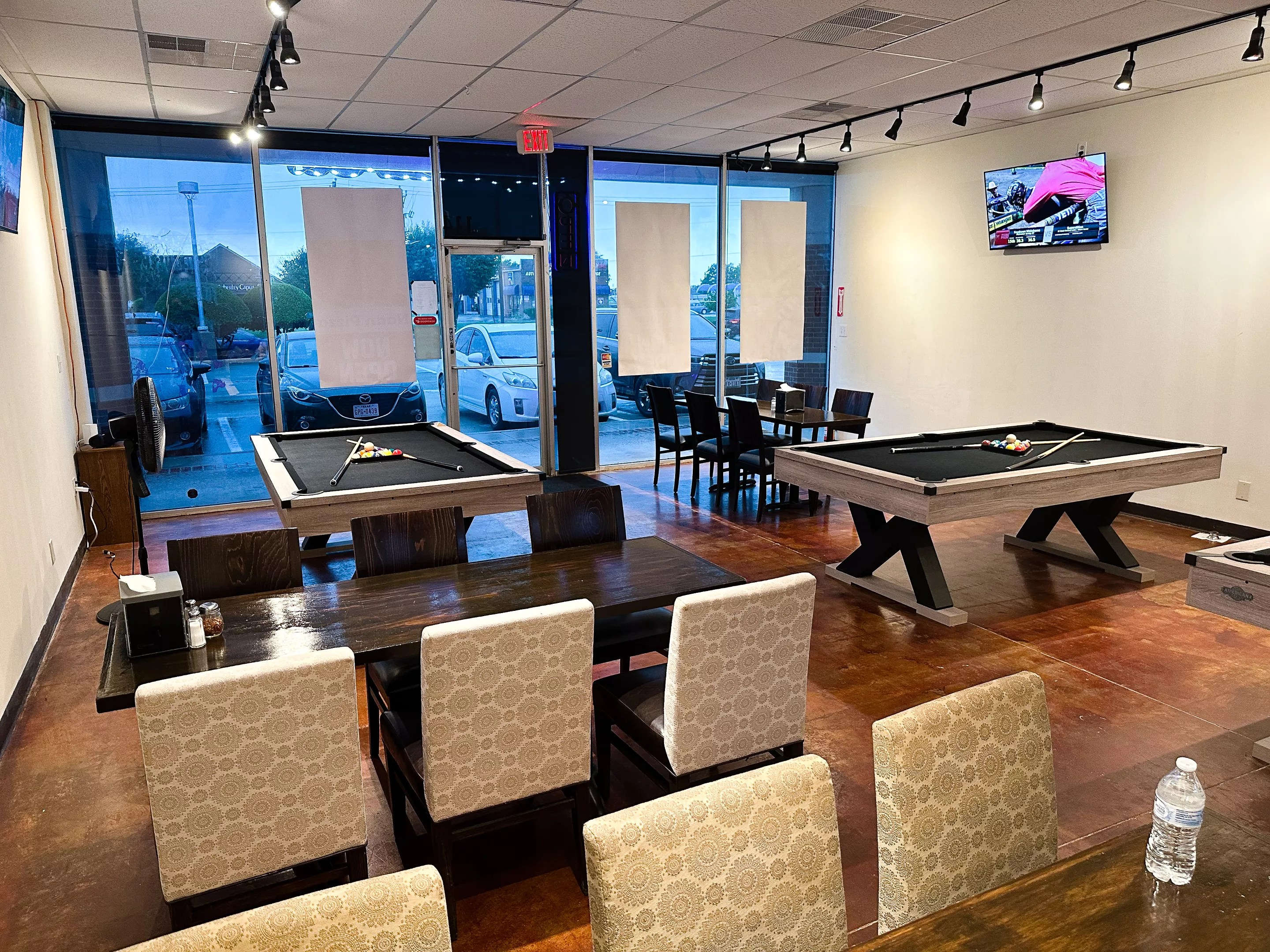 A clean dining area complete with pool tables and comfy chairs awaits you at Eastern Pizza Co. in Carrollton.