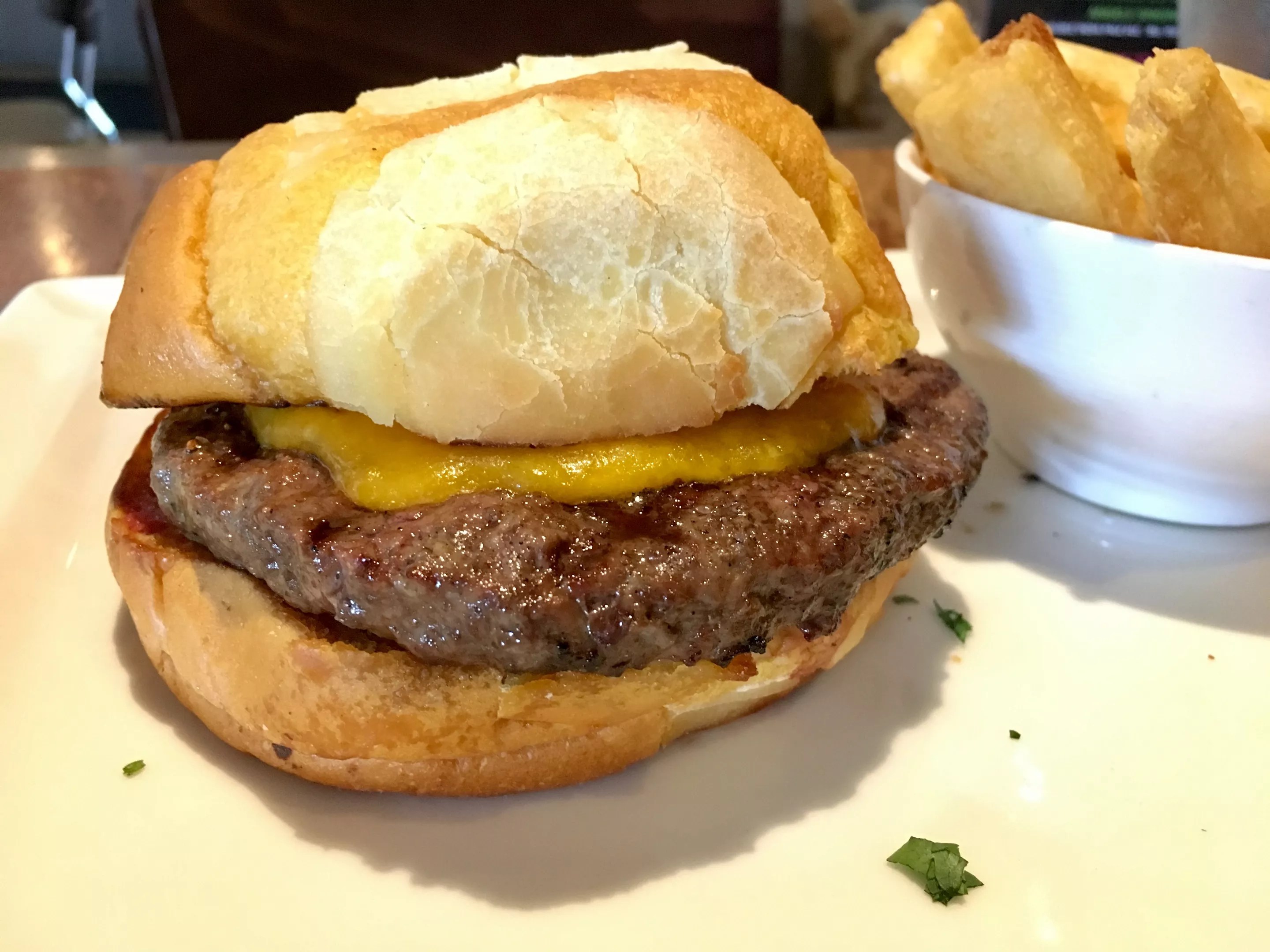 The burger’s bun is the same one used on their South American-meets-Colombian-meets-Cuban sandwiches. It has all of the sensations you want from a burger bun: soft and crunchy with stretchy cheddar over juicy beef that satisfies you down to your socks.
