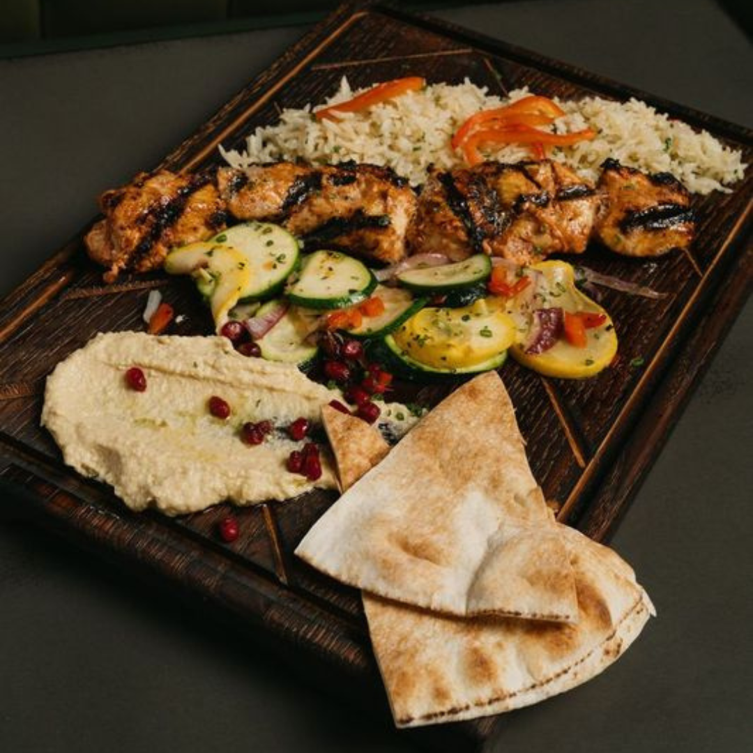Chicken kebabs are served Lebanese-style with marinated chicken skewers, rice and grilled vegetables alongside pita bread and hummus topped with pomegranate arils ().