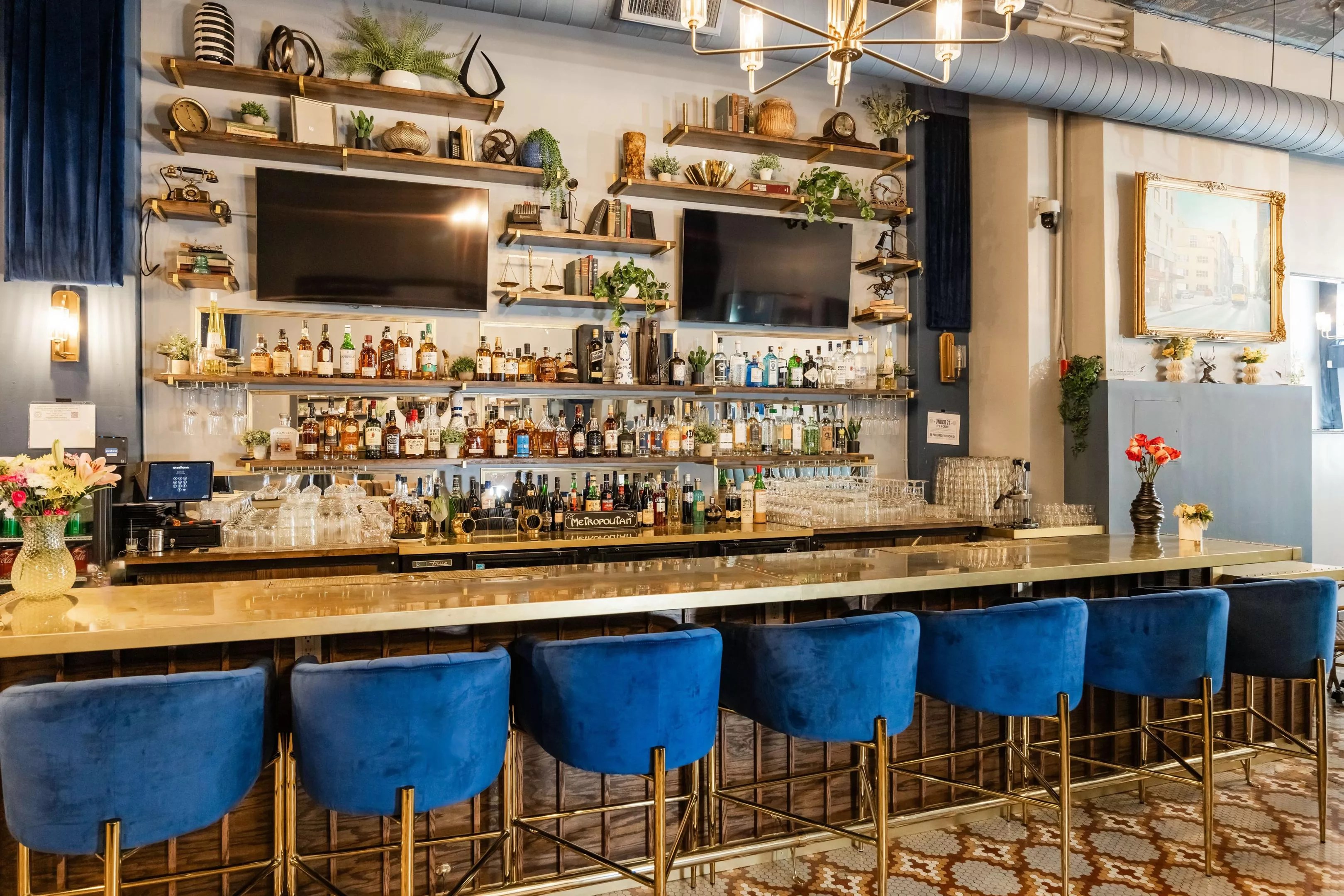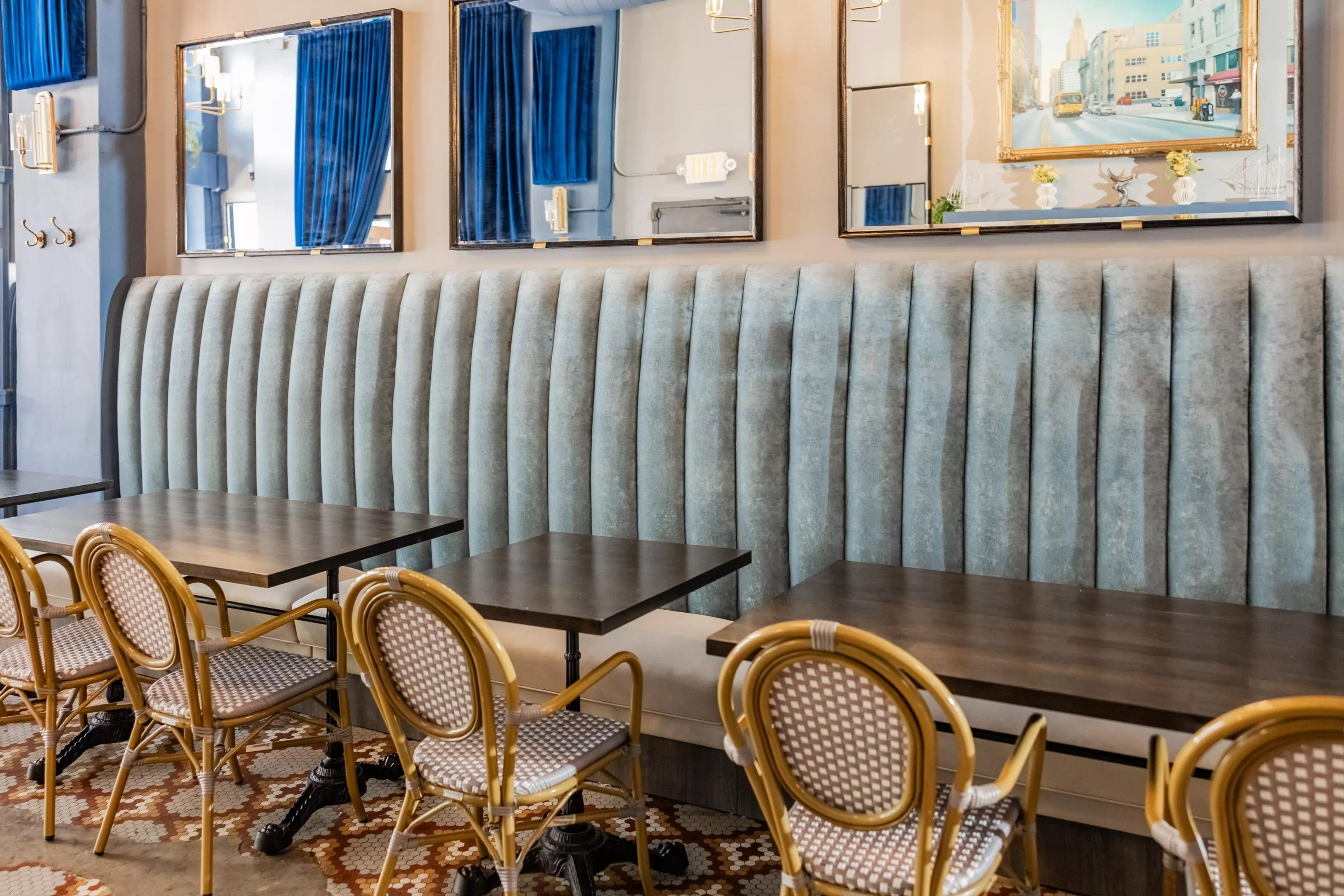 A historic space in downtown Dallas that’s been around in one form or another since the early 1900s has recently had a swank infusion. The Metropolitan on Main is now open for breakfast, lunch and happy hour in downtown Dallas; dinner service hours will follow. Banquet-style seating with dusty blue velvet booths and bistro-inspired chairs. Kayla Enright