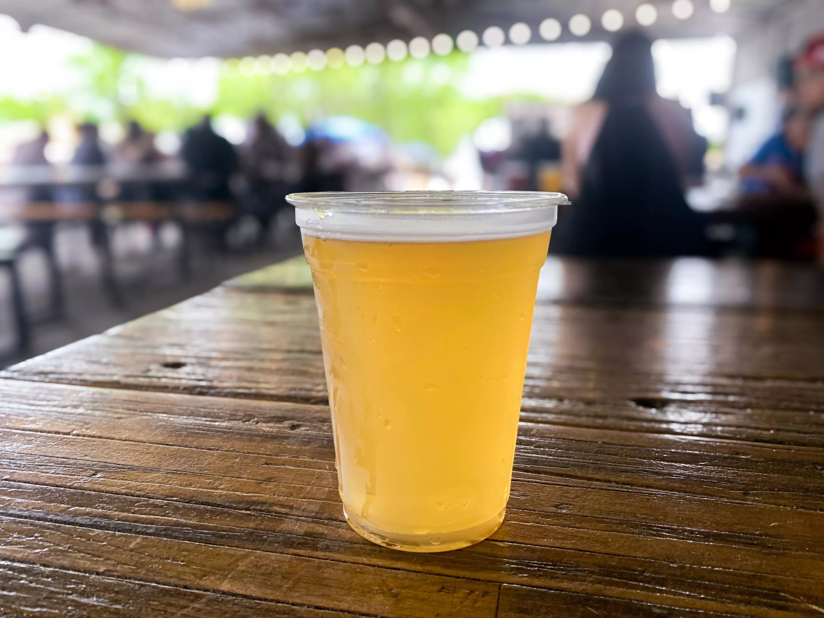 Three main buildings, sandwiched by outdoor hangout spaces, make up the property. The Grain Room Taproom houses the main bar and kitchen area, with indoor tables and large projectors for sports. To enjoy the nice weather, we opted for the beer hall, a covered patio with long tables and a small stage where musician Benton Lawson played an acoustic set.