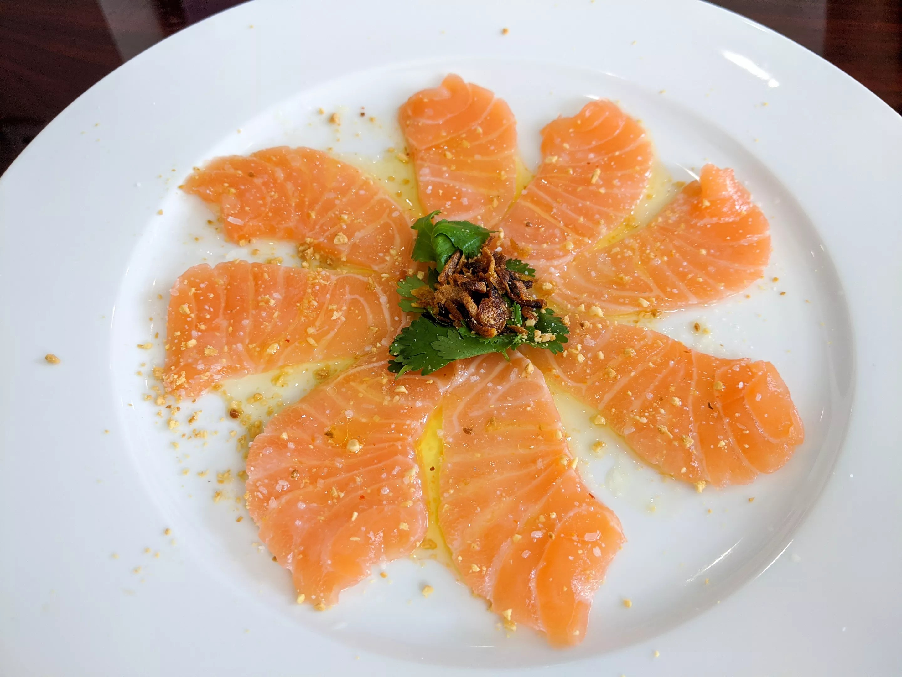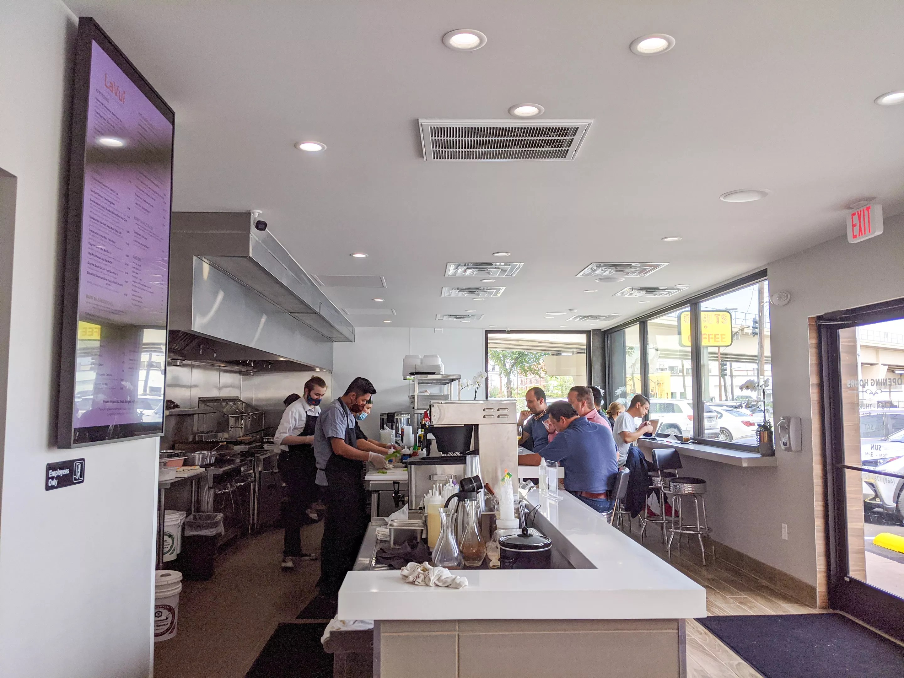 The bones of the former doughnut shop – which closed in August 2019 – are still present in the long display counter, where LaVui’s cooks now prepare spring rolls and carpaccios, and the tiny dine-in space. This building was designed for customers to pop in, grab food and leave. At least for now, there are just two tables and counter seating.