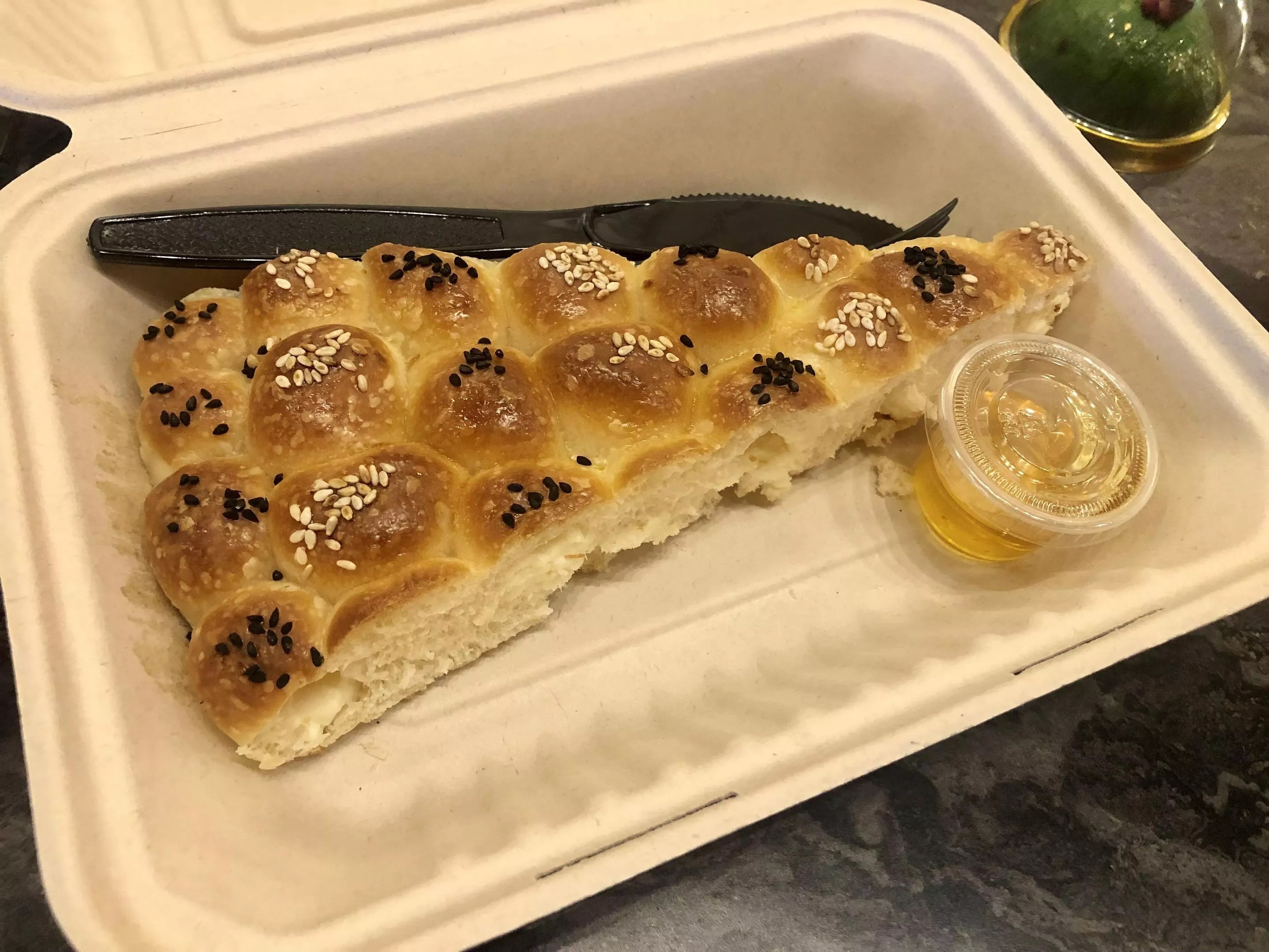We started with the honeycomb bread, a collection of small, pillowy Spring Creek Barbeque rolls (if you know, you know) nestled together in a honeycomb pattern. Each mound is filled with cream cheese, topped with sesame and black cumin seeds and served with a side of organic honey. We’d happily take one of these any (and every) day; it was a great companion to the latte.