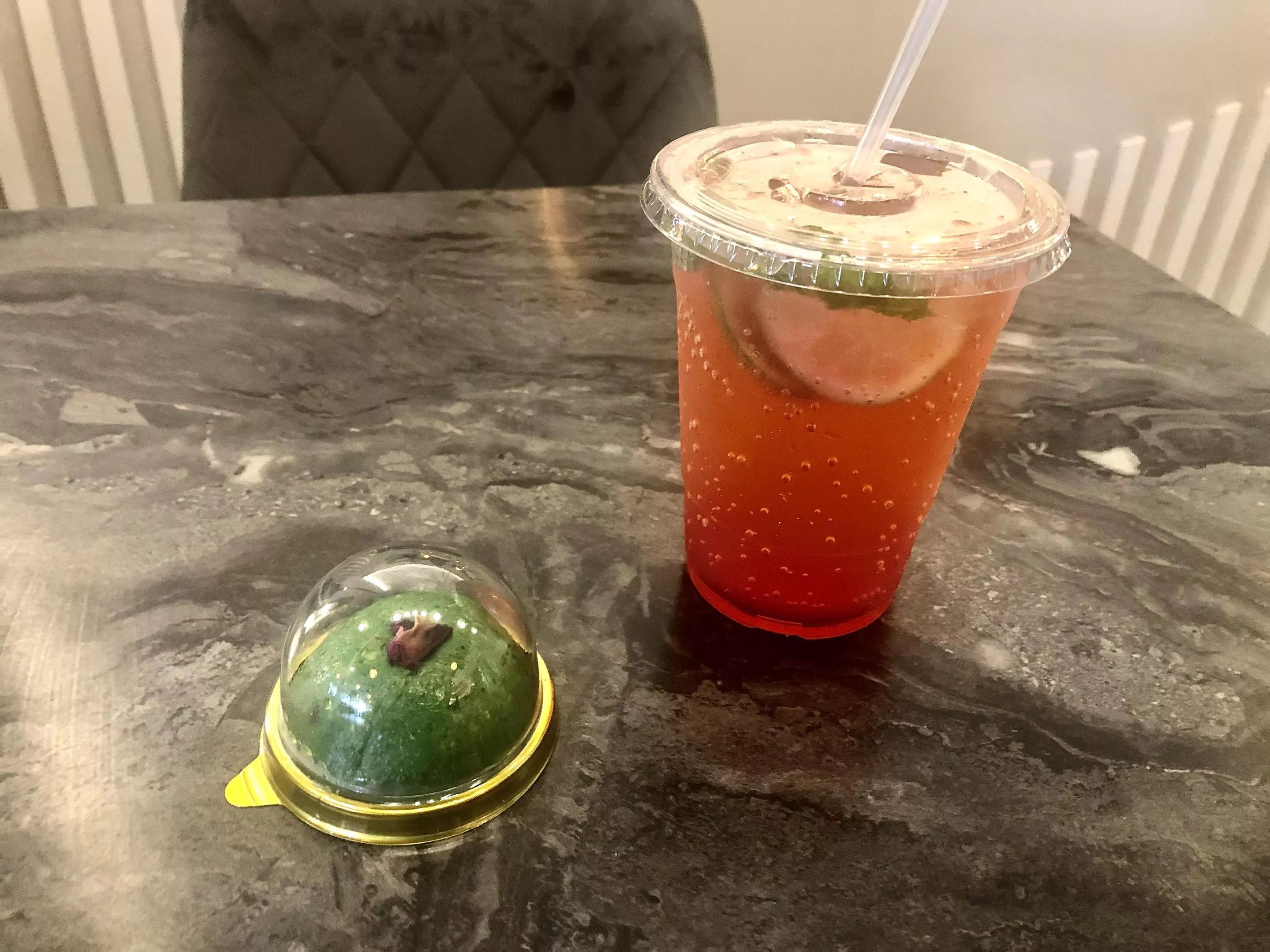 We opted for the latter; it was delicious, although almost too syrupy-sweet. Later on, we topped off what was left of it with a can of plain sparkling water, which worked like a charm to tone down the sweetness. That aside, we loved the raspberry and mint together, and it’s a drink we’d order again.