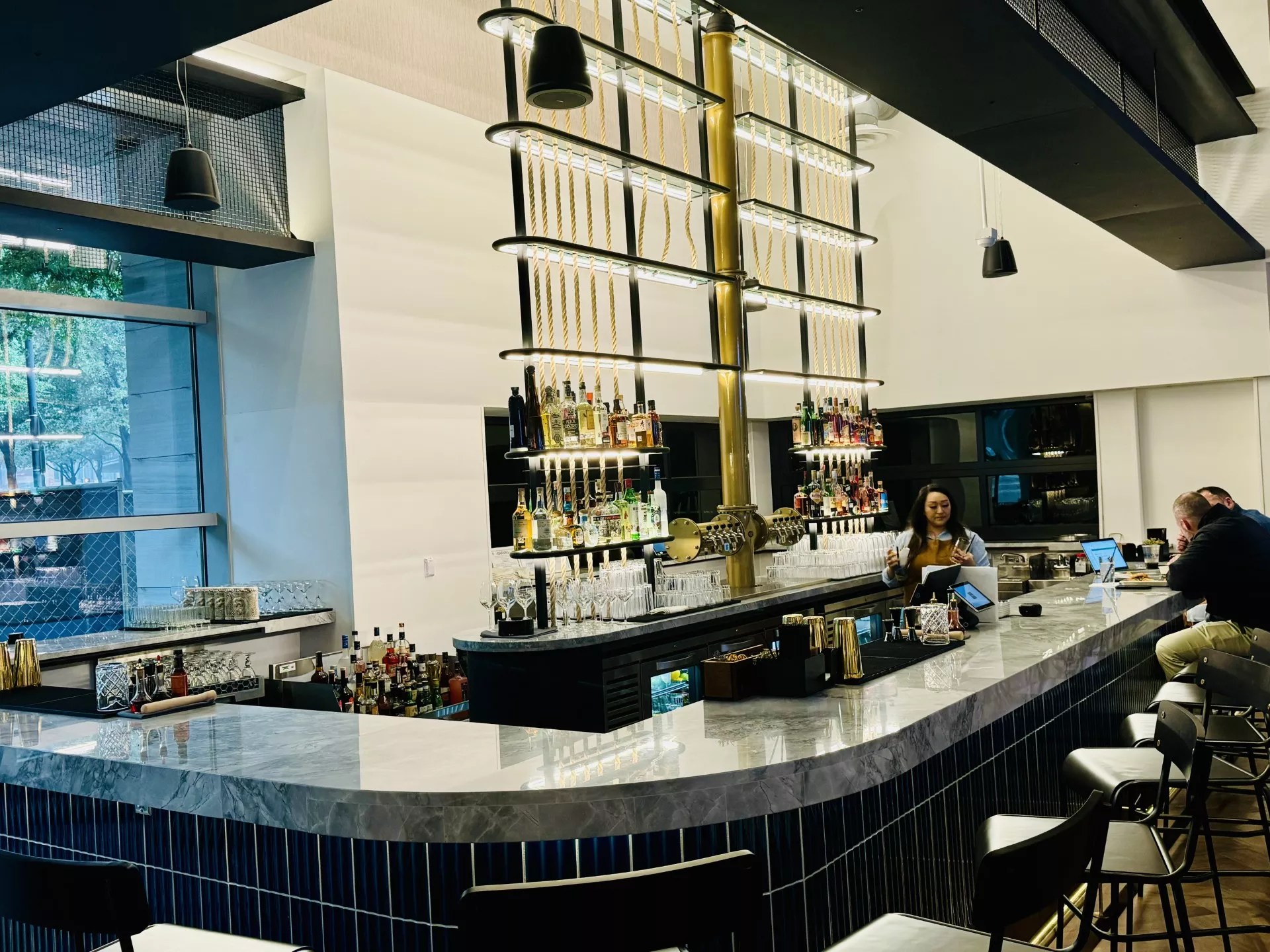 There’s a lot to like here. The options are diverse and, from what we can tell, all created with attention to detail and high-quality ingredients (everything is made to order). Pork belly and smoked salmon bagels, Indo-Chinese chili mushroom tacos, Tori Katsu chicken sandwiches (thinly sliced panko breaded chicken breast with cilantro slaw and Japanese mayo on Texas toast), steak frites and French fries fried in tallow beef fat, mortadella pizzas, white wine mussels, smoked cream risotto, chocolate croissants, chai lattes and cocktails. And that’s just scratching the surface at Victory Social.