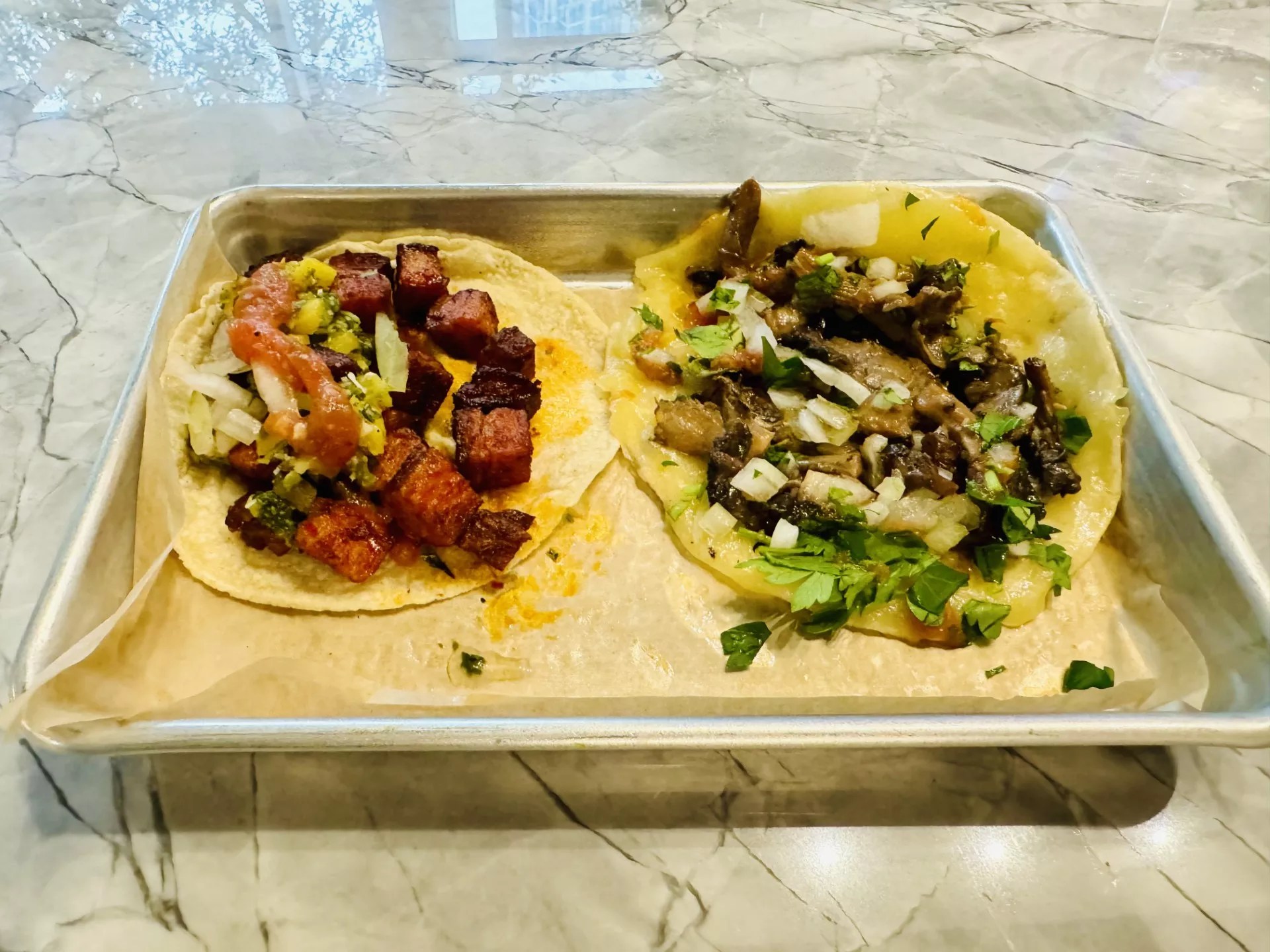 Smoked pork belly pastor (left) and chili mushroom tacos at Itza.