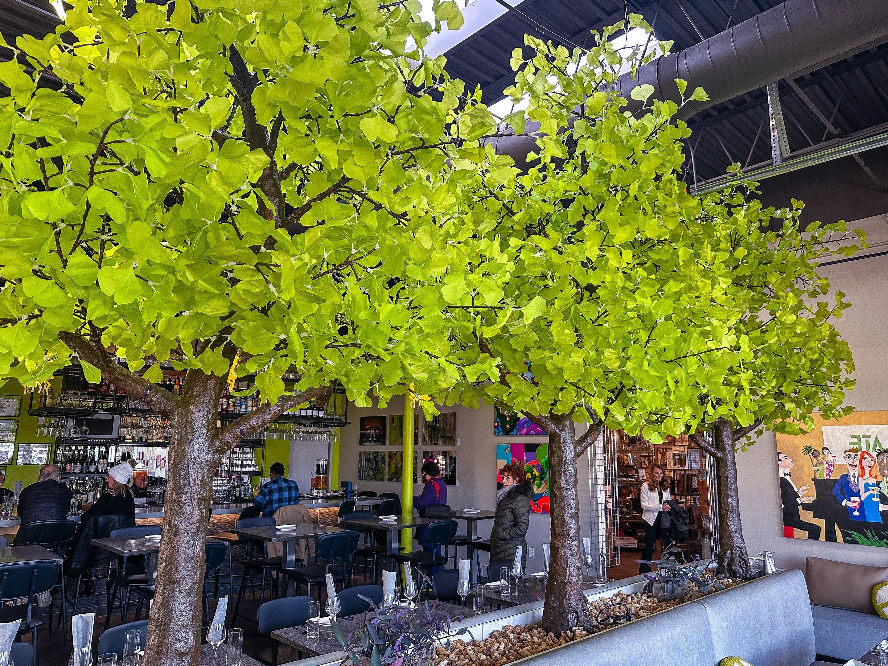 The space is bright and colorful, yet subdued, with warm light greens and yellows prominent in visual harmony with the foliage of the three ginkgo trees that are the main focal point, their bases sitting in a wine-cellar’s worth of discarded corks. The walls are covered with local artwork that is for sale, which also contributes to the overall palate/palette of the interior as well.