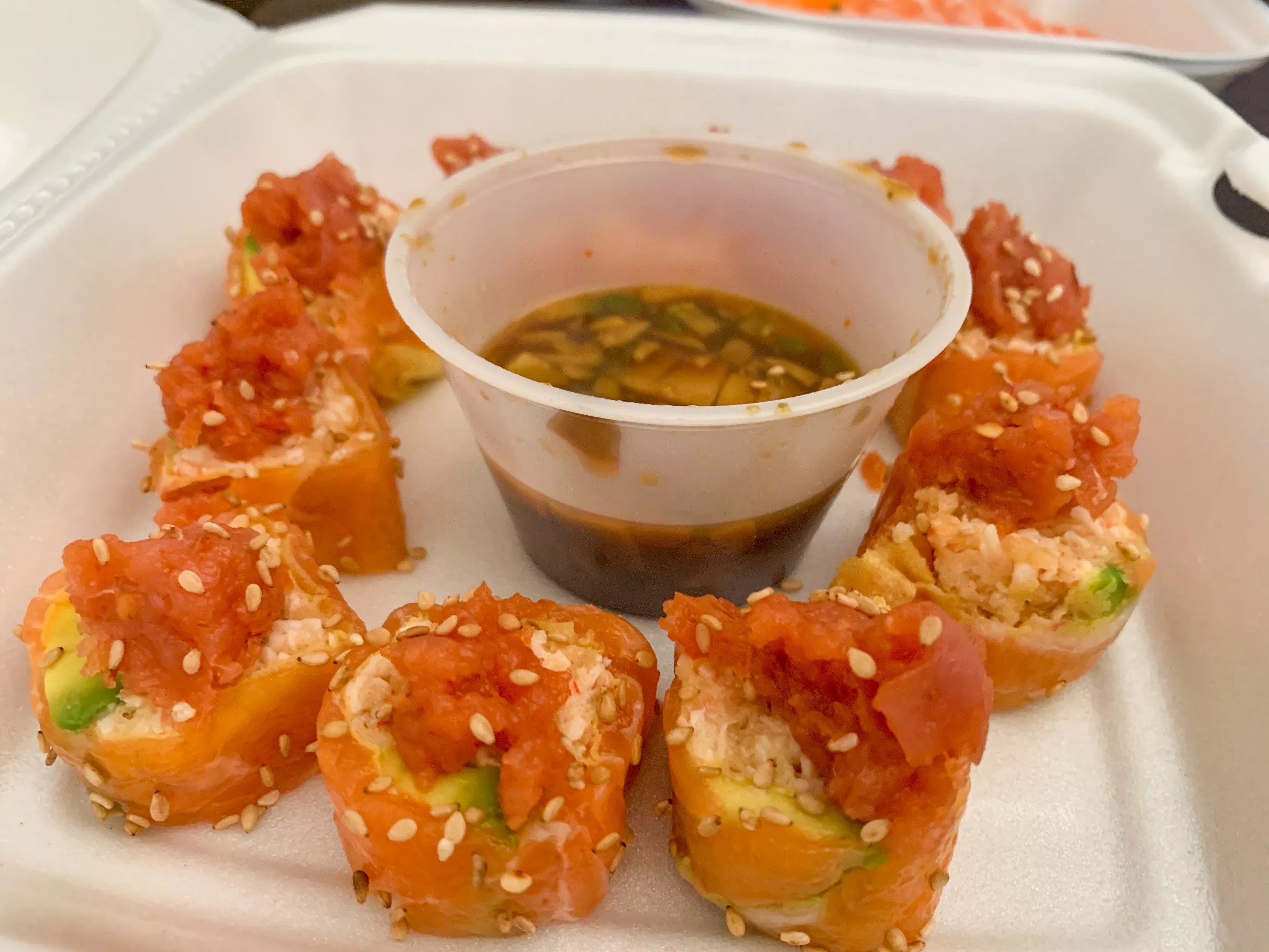 A friend recommended the Cesar roll: Crab mix is combined with tempura flakes, wrapped with salmon and topped with spicy tuna. It would be topped with diced avocado and spicy ponzu sauce in the restaurant, but that’s saved in a plastic cup for dipping in the takeout version. It also has plenty of sesame seeds all over it. It’s a fine plate if you’re looking to avoid carbs.