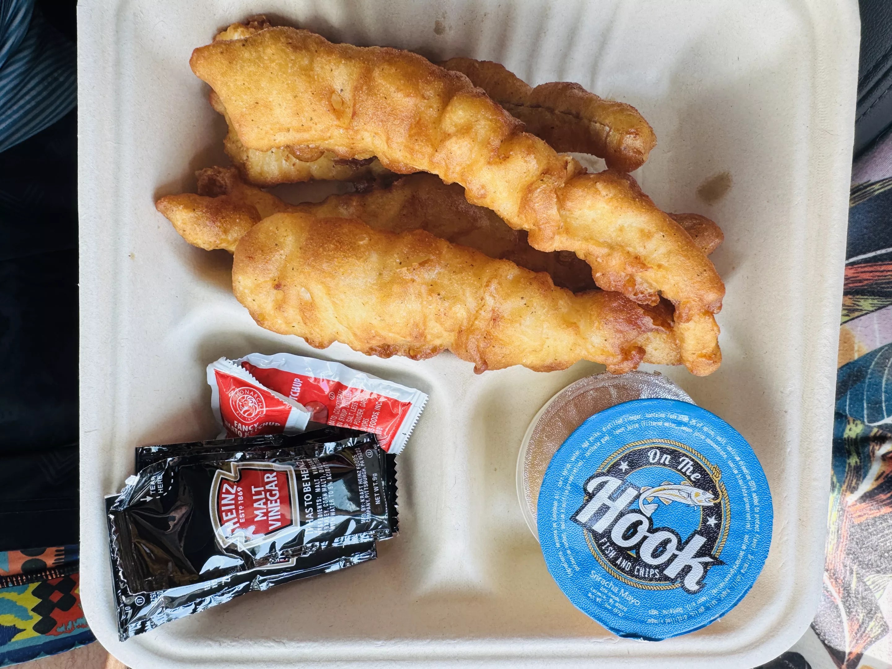 The standard plate comes with three massive pieces for $14, with the option to add one more for $4. With the extra, it was definitely big enough to split. The sauces are also handmade with secret recipes – the sweet chili, chipotle mayo, and original tartar are all fan favorites. The fries are seasoned and battered with that signature crunch, made to be bathed in malt vinegar. Dunking and dashboard dining was a bit of a balancing act, but we made do.