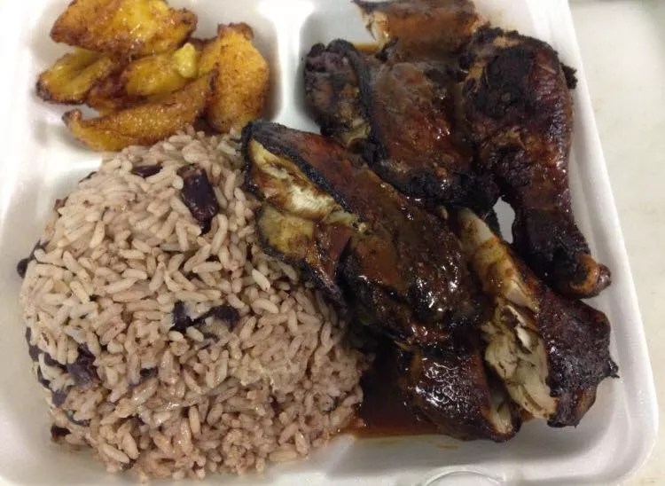 Jerk chicken with rice and plantains, one of several Jamaican dishes you'll find on the menu at One Love Lounge.