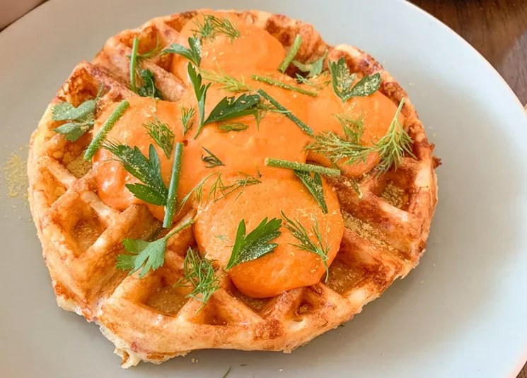 Now, Homewood doesn’t need any hype from me, but what people do need to know about is Choron sauce. It comes on the ham and cheese waffle, a savory take on this breakfast standard ($17). We see the price tag has increased by $2 since we were last there, but I stand by this waffle that has this velvety tomato sauce. The waffle has a proper balance of salt and is the perfect vehicle for the savory Choron that just gently leans a bit sweet. The whole thing is topped with dill and chives, and because just a touch of umami can’t hurt anything, it’s finished with a light dusting of nutritional yeast.
