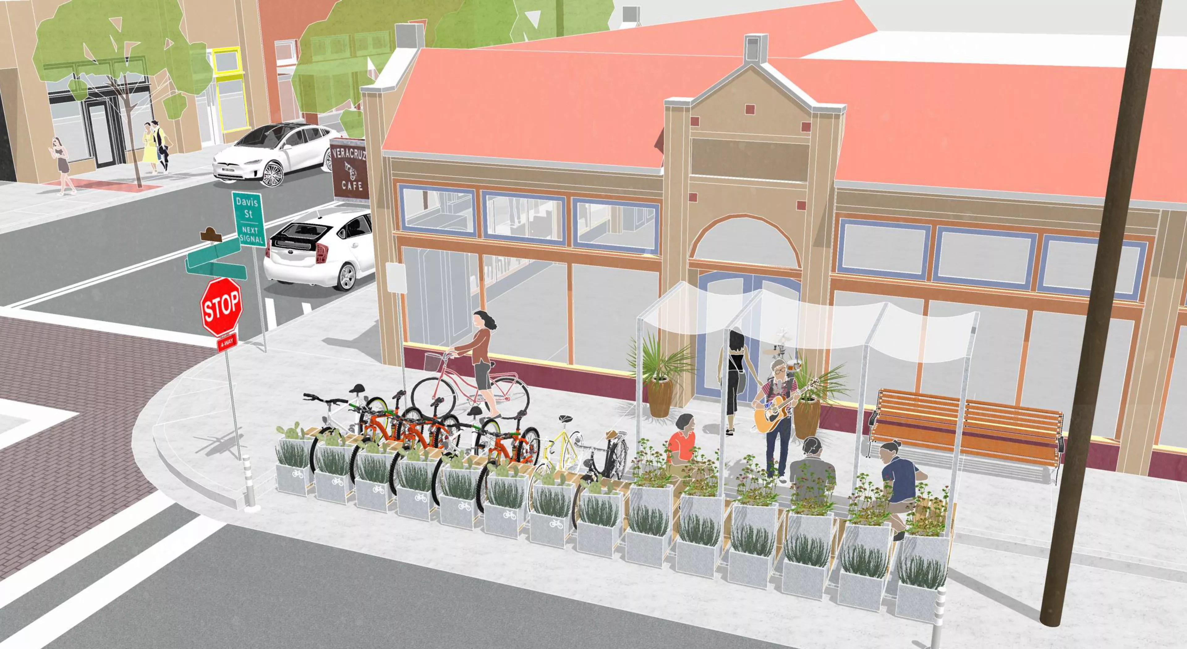 A rendering of the upcoming permanent parklet at Veracruz shows space for bike parking and restaurant seating.