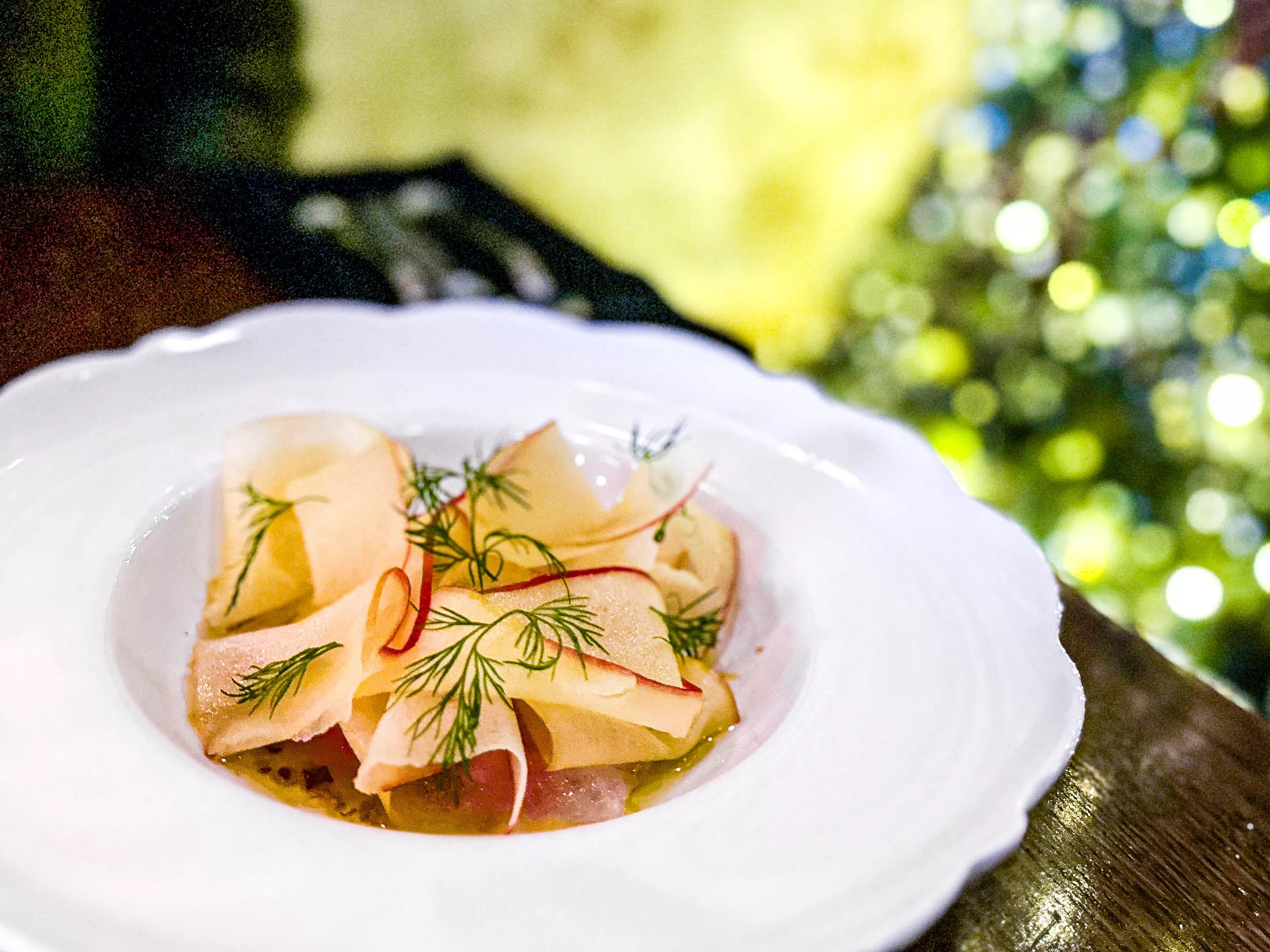 Hamachi and apple, served in citrus olive oil with kimchi and dill.