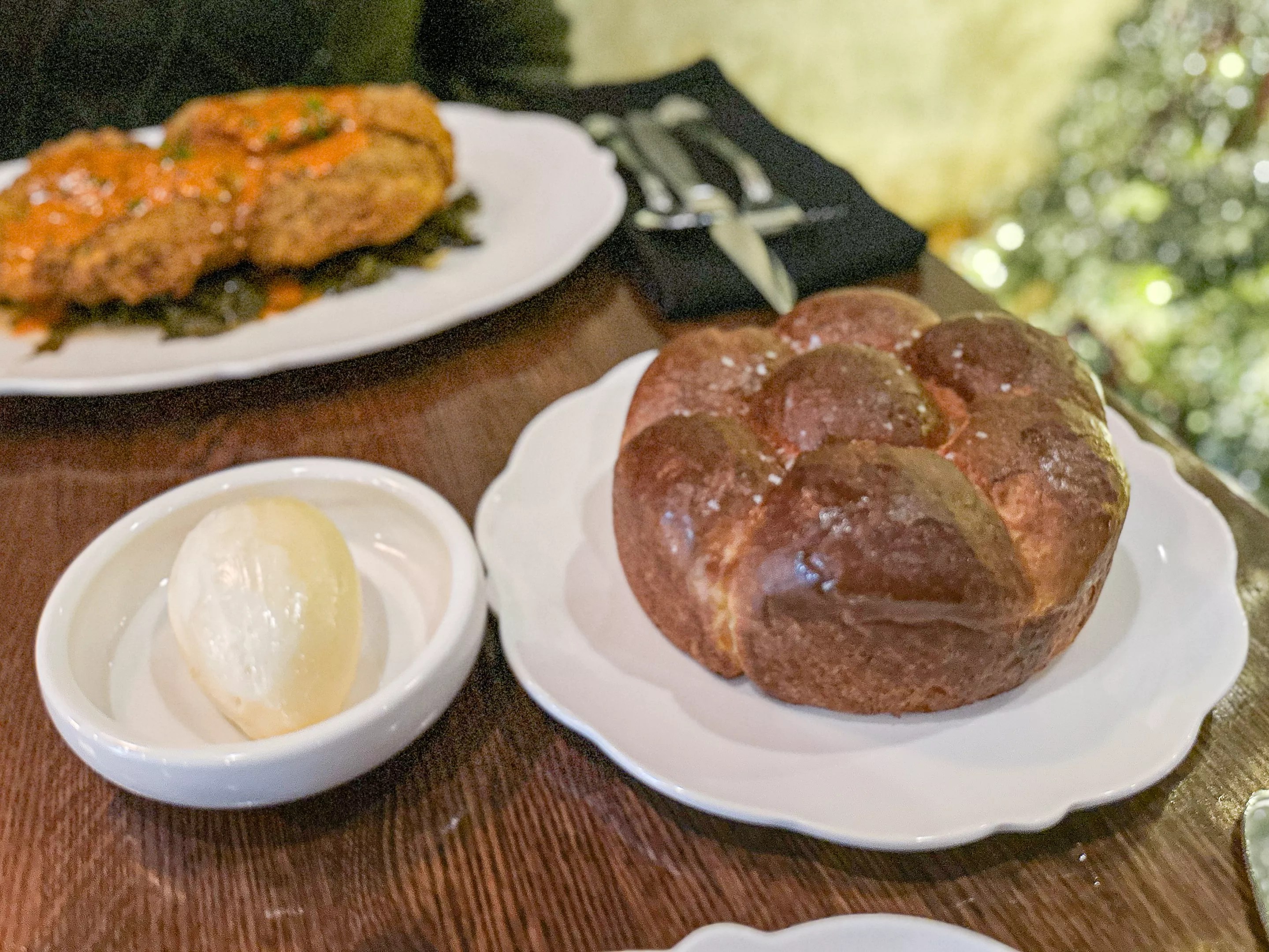 The fried chicken comes with a generous serving of cornmeal brioche, along with a lot of butter.