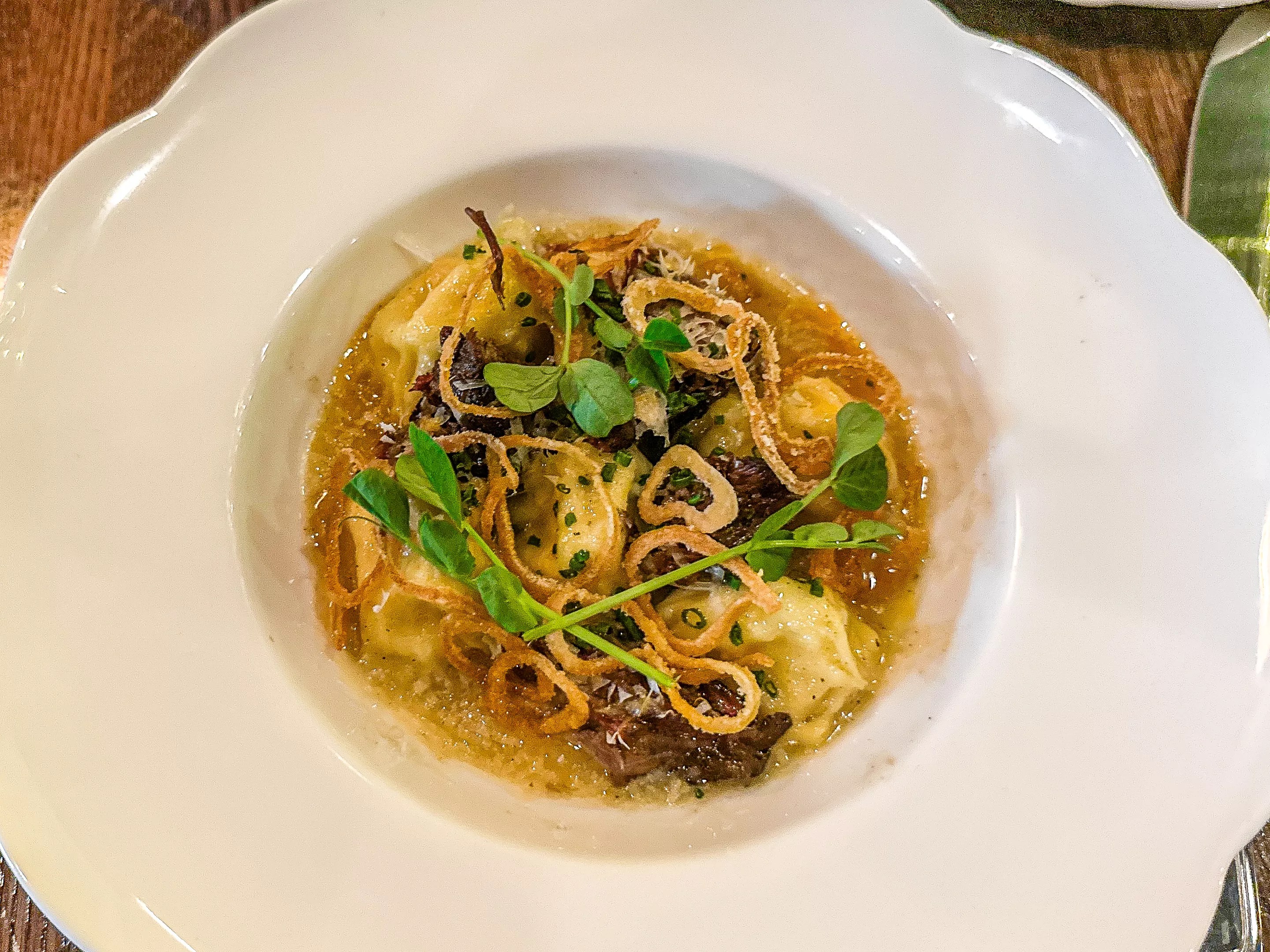 The agnolotti are filled with ricotta and onion and served with grilled short ribs and crispy onion.