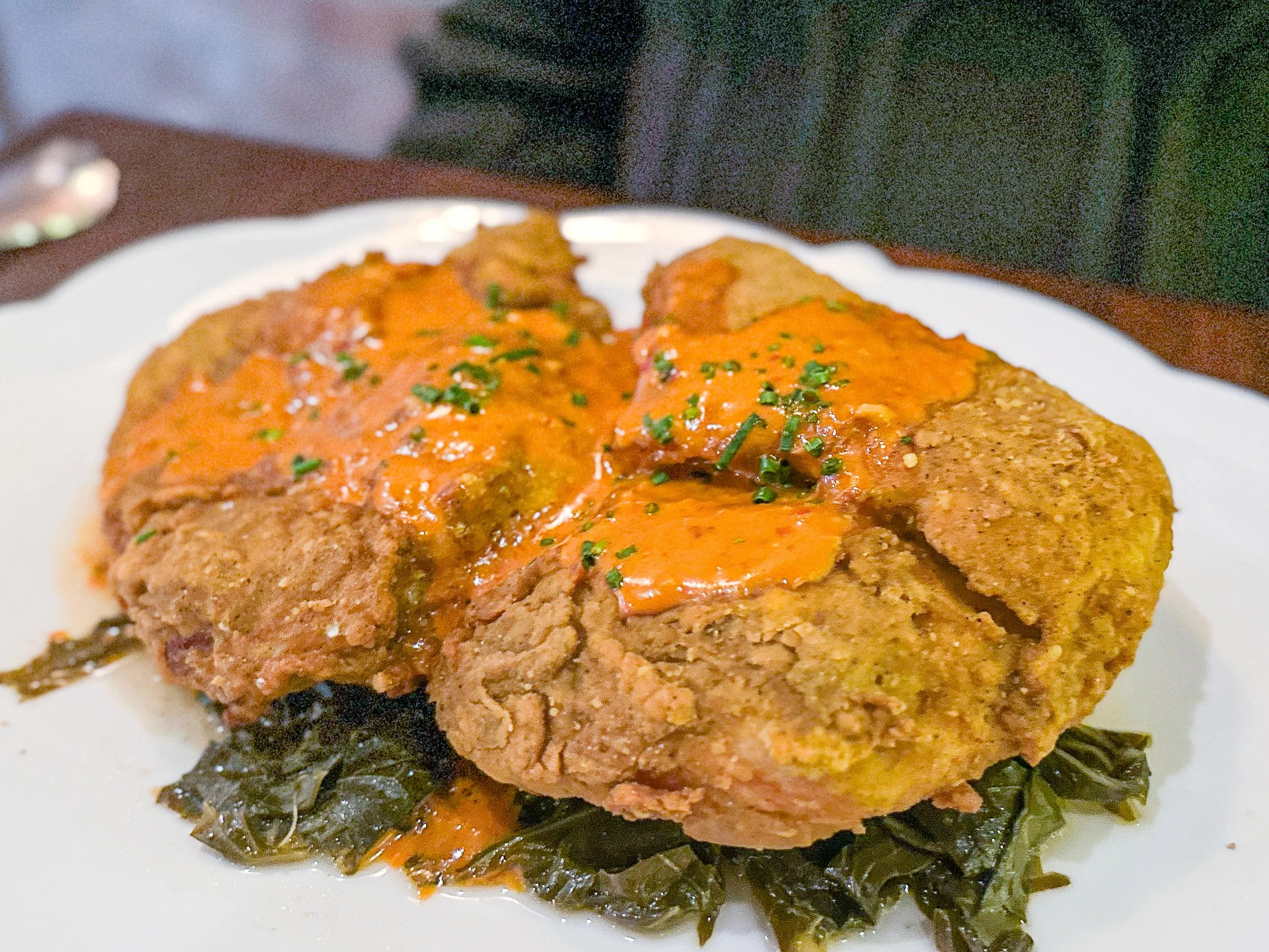 The fried chicken is a huge portion served on a bed of collard greens and topped with a nduja cream sauce.