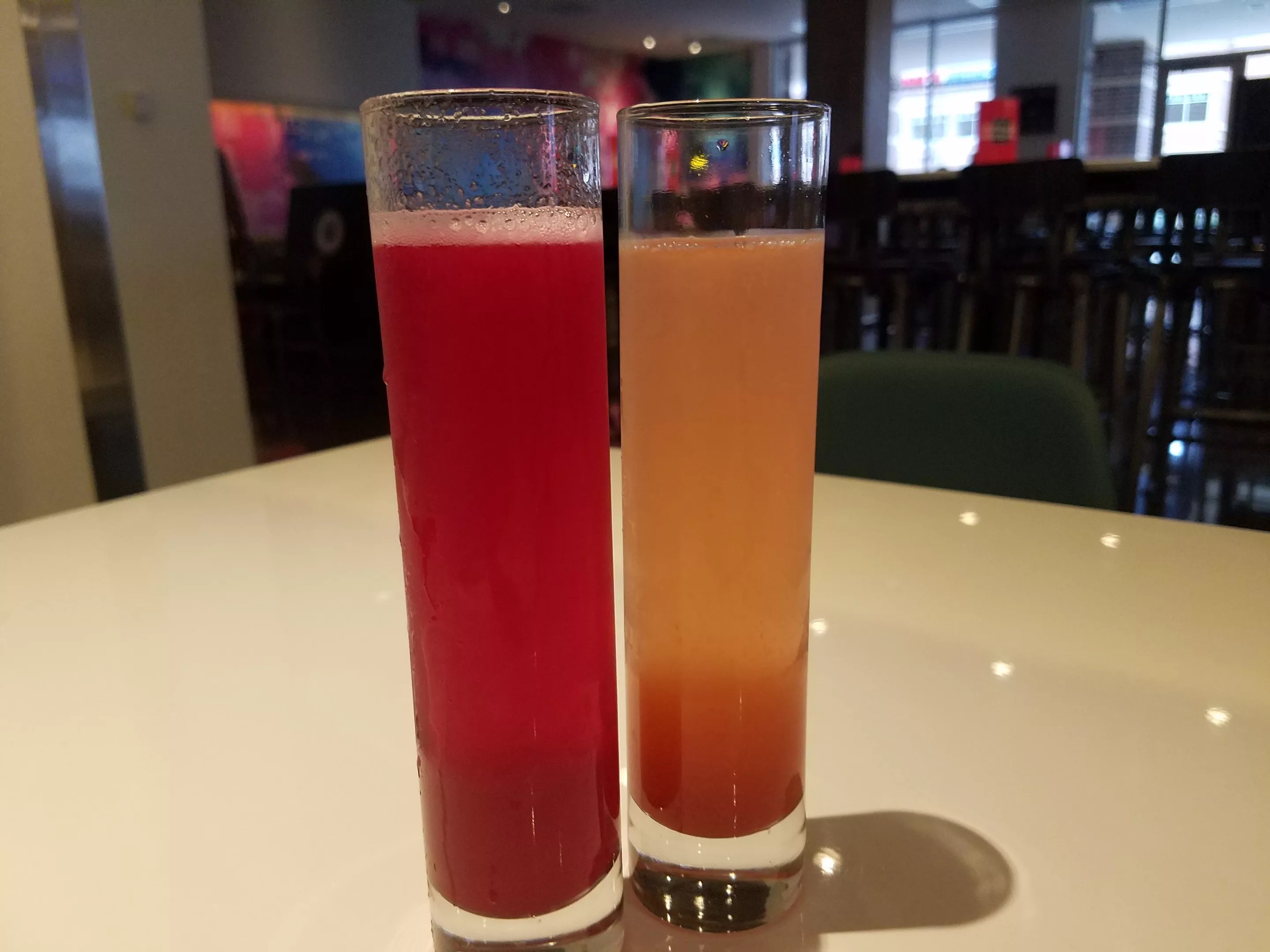 Nerdvana is mimosa mecca. Featured here are the prickly pear (left) and raspberry mimosas.