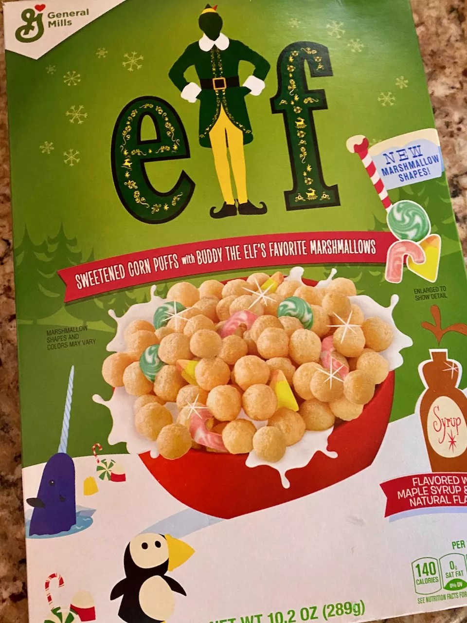 On the surface, this seemed like a slam dunk for the best breakfast ever. With a serious infatuation with all things Elf-related and a cereal co-dependent household, we thought this box was sure to be gone in an hour. Instead, we never finished it. Had a weird taste and texture. This actually sort of broke our hearts.
