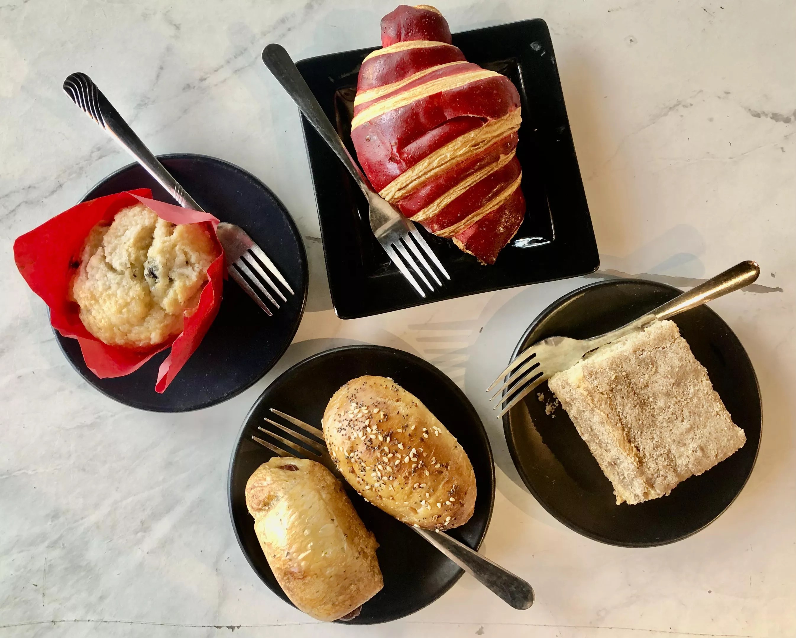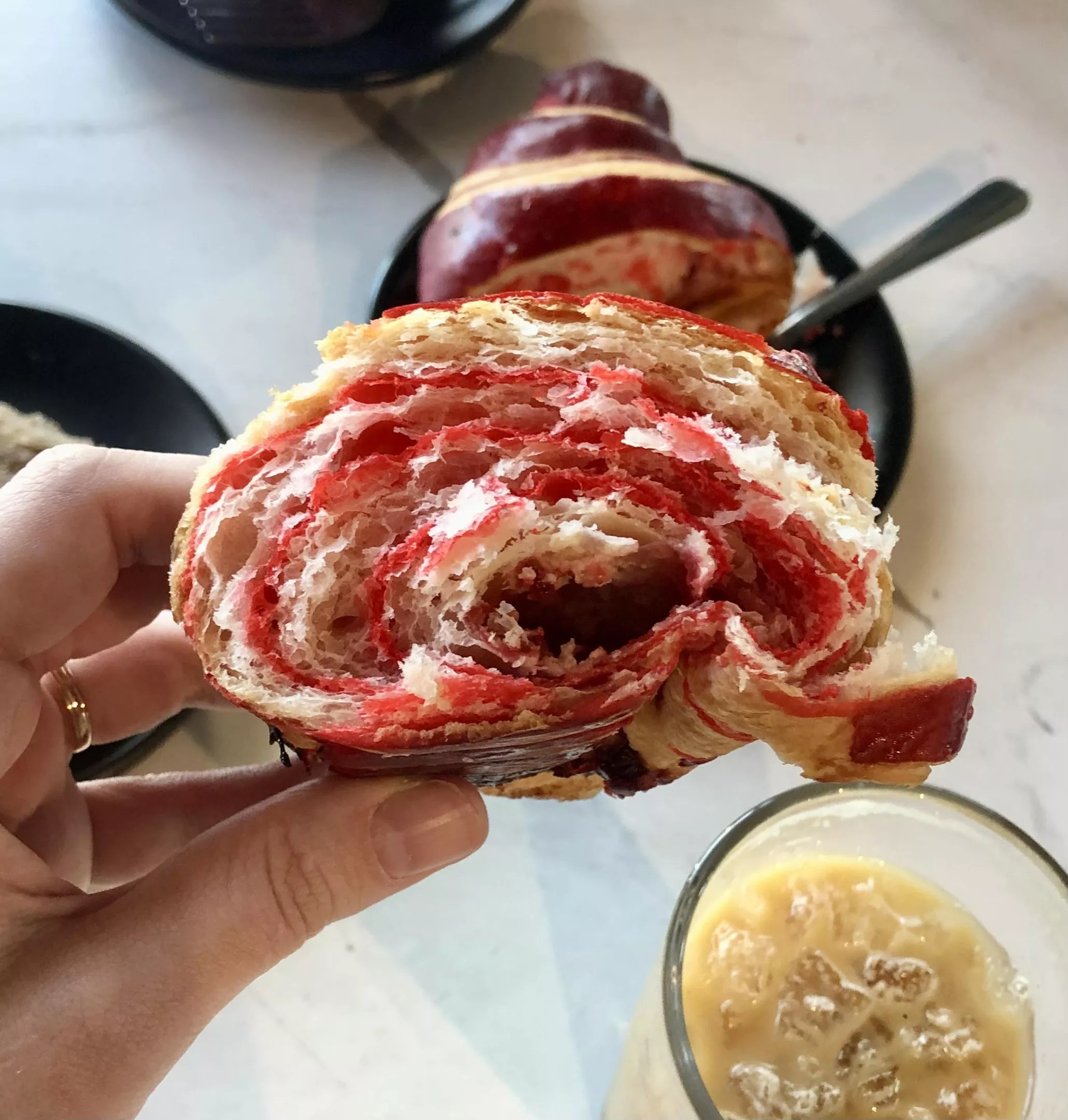 A croissant with ribbons of berry jam spiraling about layers of puff pastry is a good and proper breakfast choice However, it is not illegal to get a cake pop with your morning coffee. In fact, it’s one of the few redeeming qualities of being an adult. This croissant has layers of what we think could be raspberry jam woven throughout puff pastry without being too sweet. Danielle Beller
