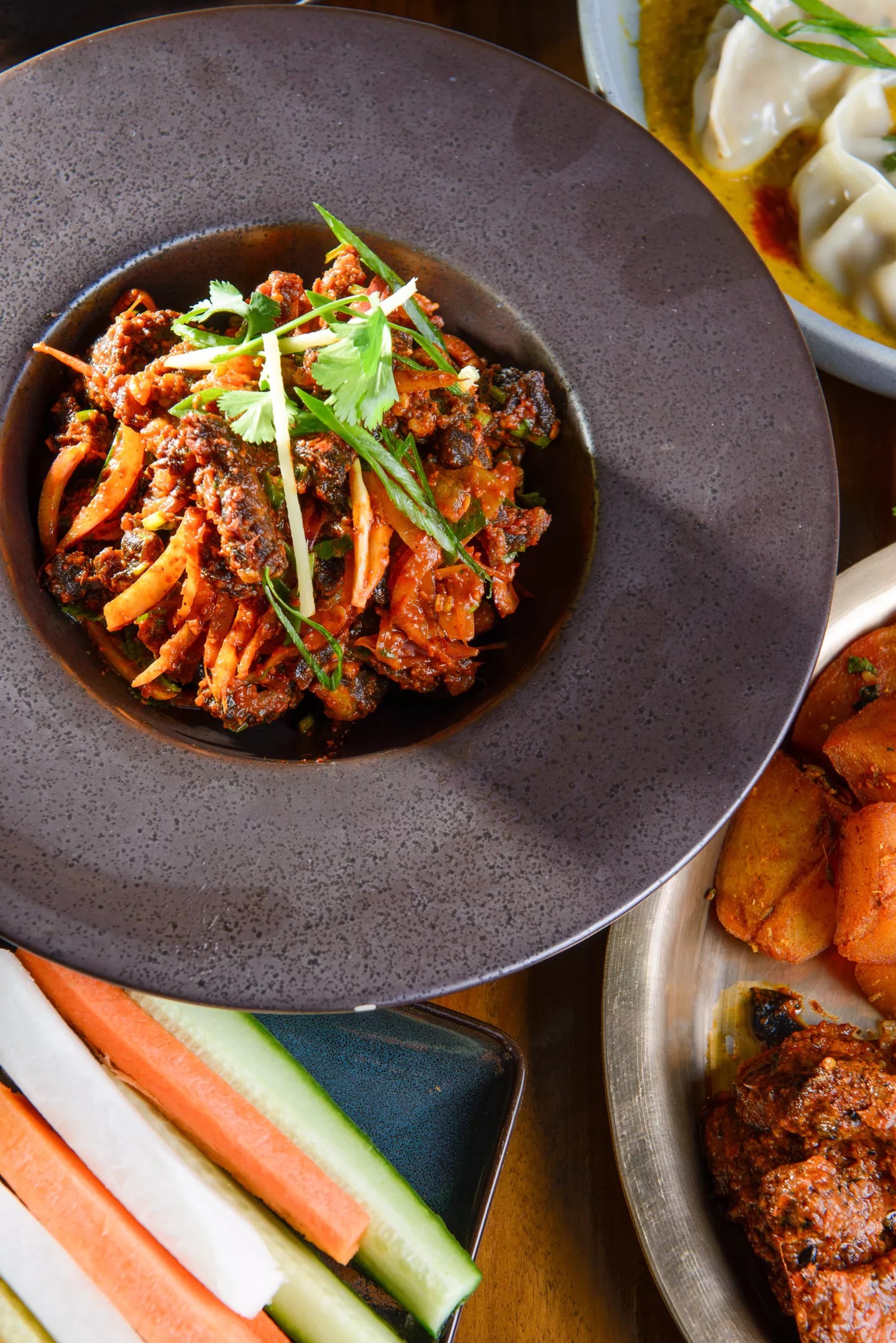 Steamed Nepalese spice dumplings immersed in signature Bajeko Sekuwa Sauce