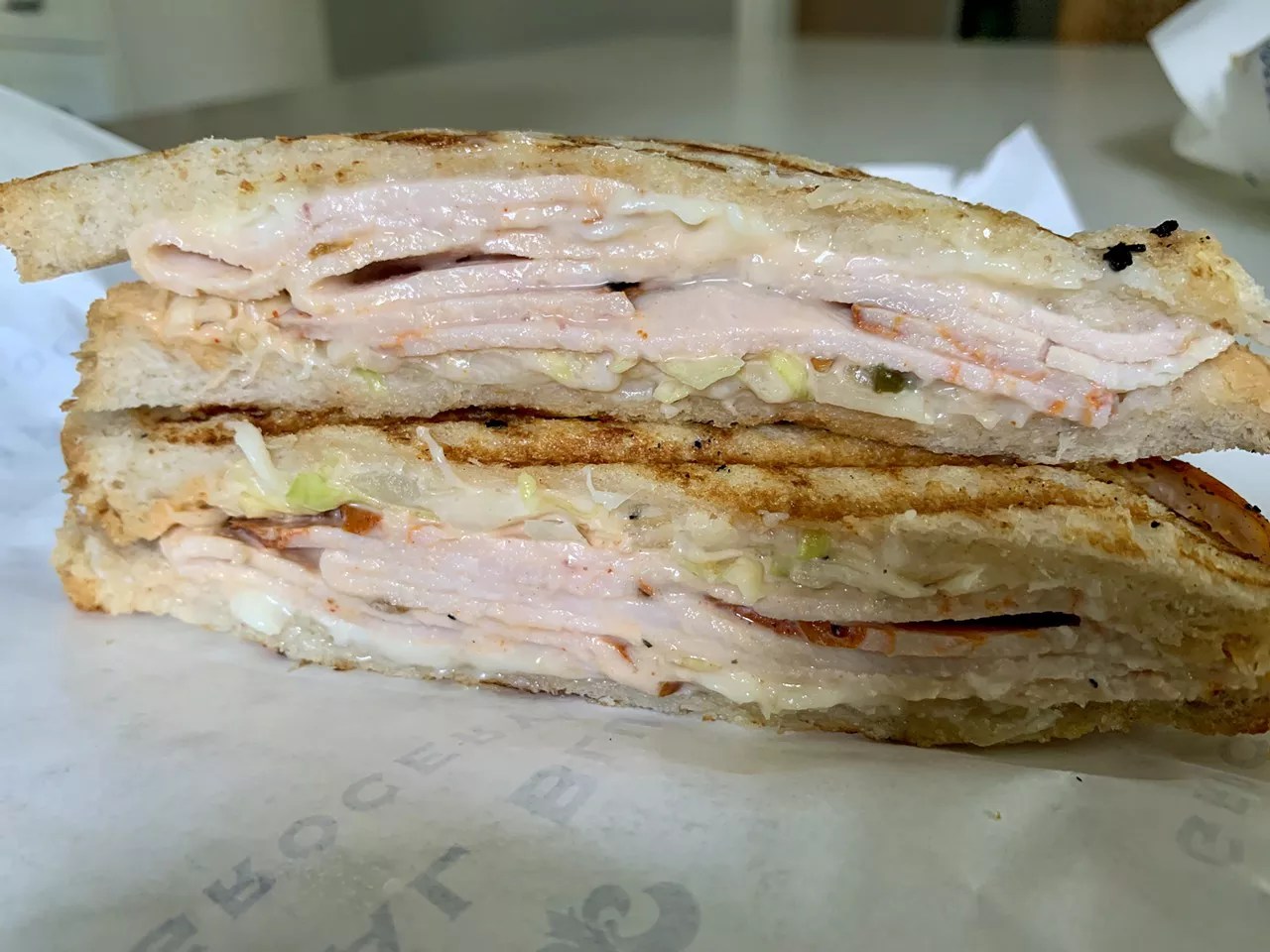 You’ll find the nostalgic comfort at Royal Blue Grocery at the sandwich counter. Each one is pressed, crackly bread embossed with a diamond pattern. They are cheesy, laden with peppers or slaw or Swiss, wrapped neatly in paper like a to-go lunch from school days.