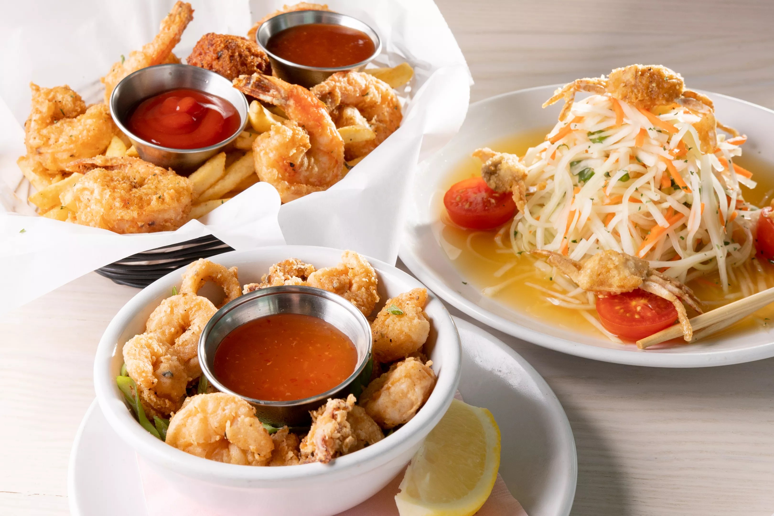 A shredded papaya salad adorned with fried crab alongside a seafood basket and calamari made with Krio’s rice flour batter.
