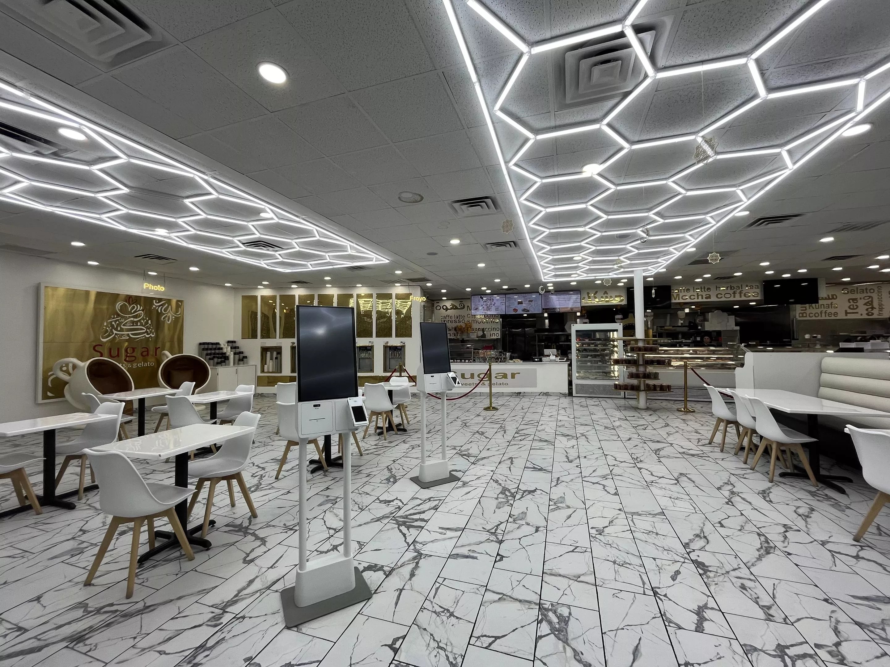 The shop, which has gone viral multiple times on Instagram for the regal interiors, matches the social media buzz. Bright, hexagonal lights make a fitting addition to the almost excessively large dining space, clearly crafted for large crowds, while gold wall plating and finely decorated floor tiles only add to the royal allure.