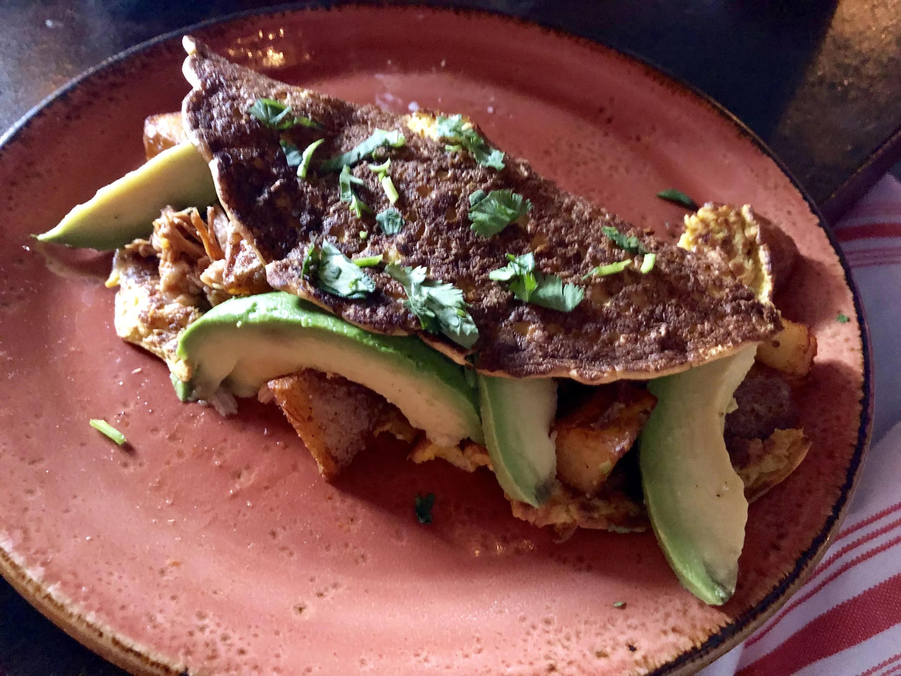 If you’re going for the sweet option, you’ll be a little happier. The besito Frances ($10) is a French toast tossed in agave and mezcal batter with toasted pecans and walnuts, baked apples, caramelized bananas and cinnamon sweet cream. It’s hard to go wrong with that combination.