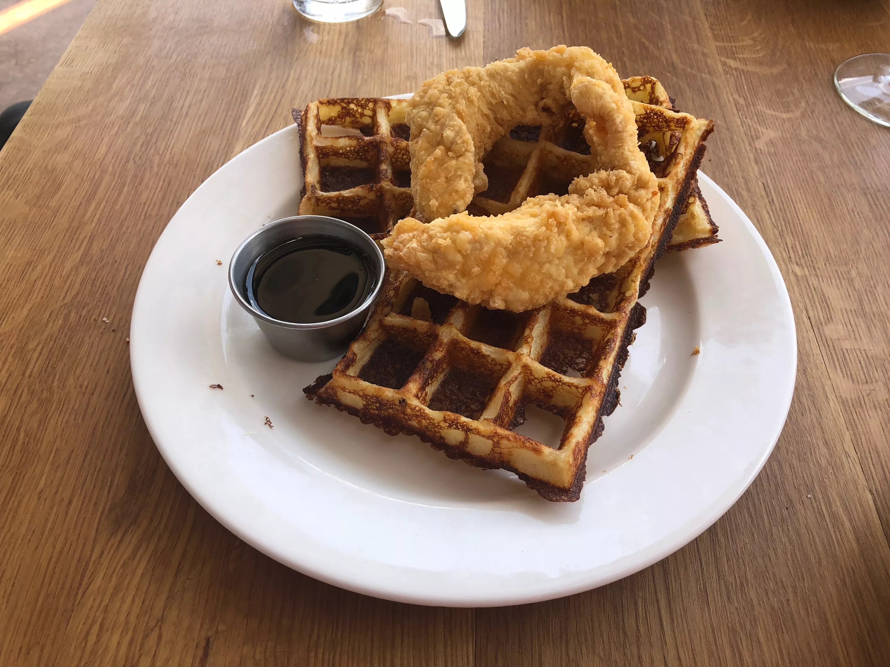 This version of chicken and waffles ($15) has chicken tenders that taste fresh and juicy, though they’d be better with a bit more salt. The real taste treat was the waffle, which had a sweet batter with a crepe-like texture. It will make you think more about getting the strawberry waffle ($11) next time.