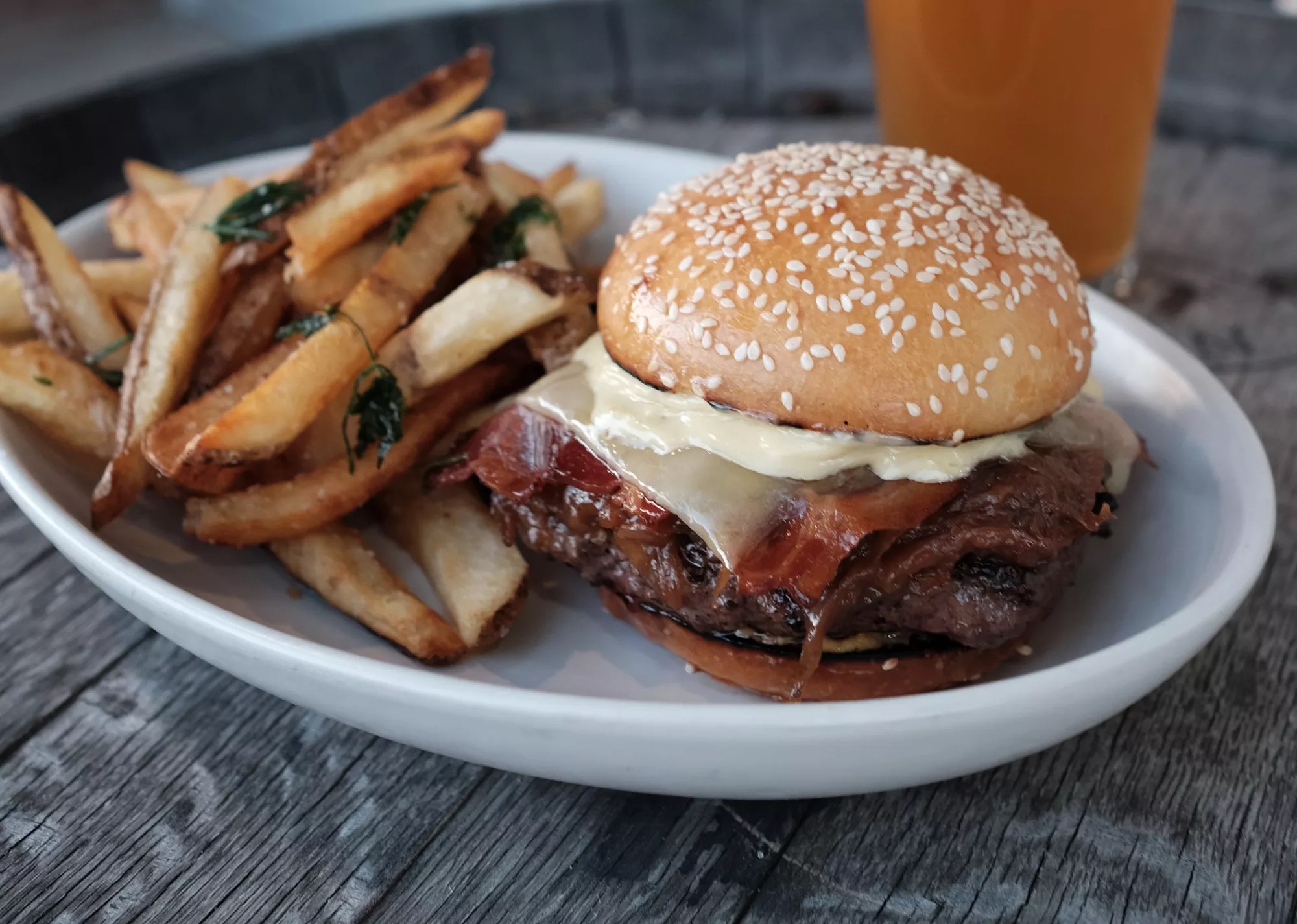 The cheeseburger with hand-cut fries at Small Brewpub for $15.