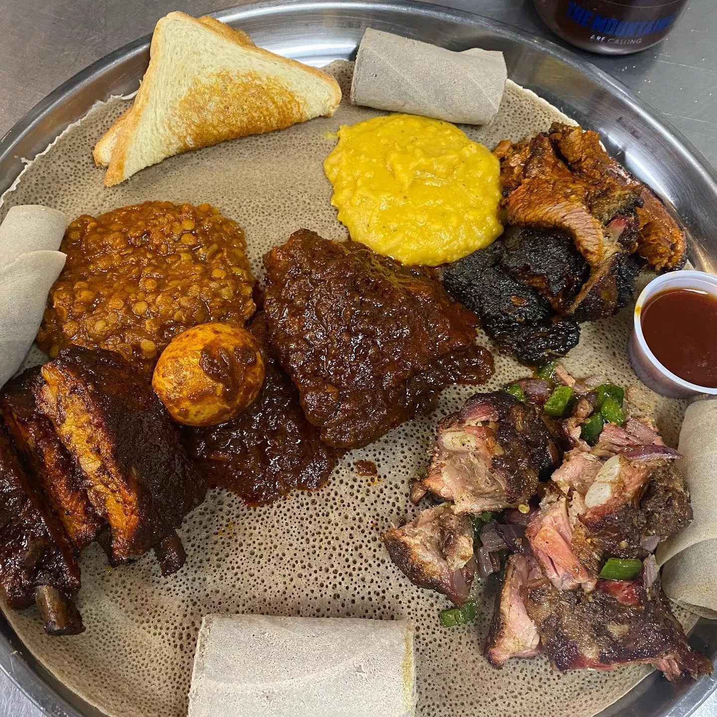 Priya Krishna with The New York Times writes, “The vibrant Ethiopian flavors – brisket comes lacquered with awaze, a spicy sauce made with berbere – are an ideal match for barbecue.”
